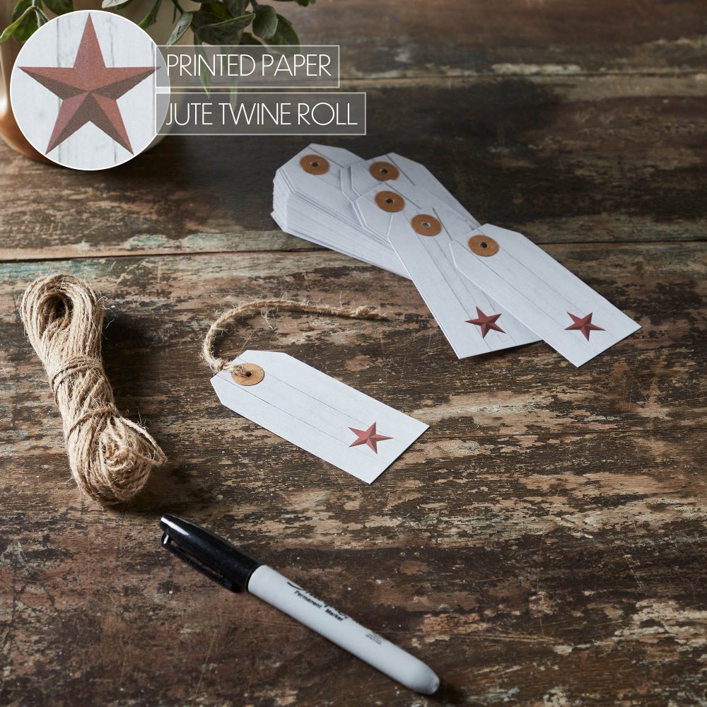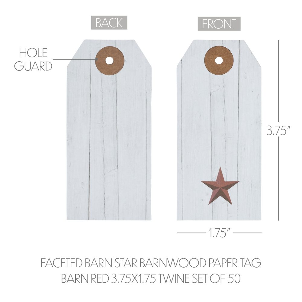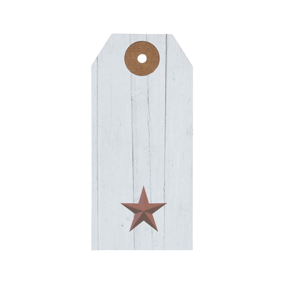 • Patriotic Faceted Barn Star Barnwood Paper Tag Set: The VHC Brands Patriotic Faceted Barn Star Barnwood Paper Tag Set includes 50 tags, each measuring 3.75×1.75, providing a charming addition to your Independence Day decor. Crafted from barnwood-inspired paper, these tags showcase a red printed barn star design.