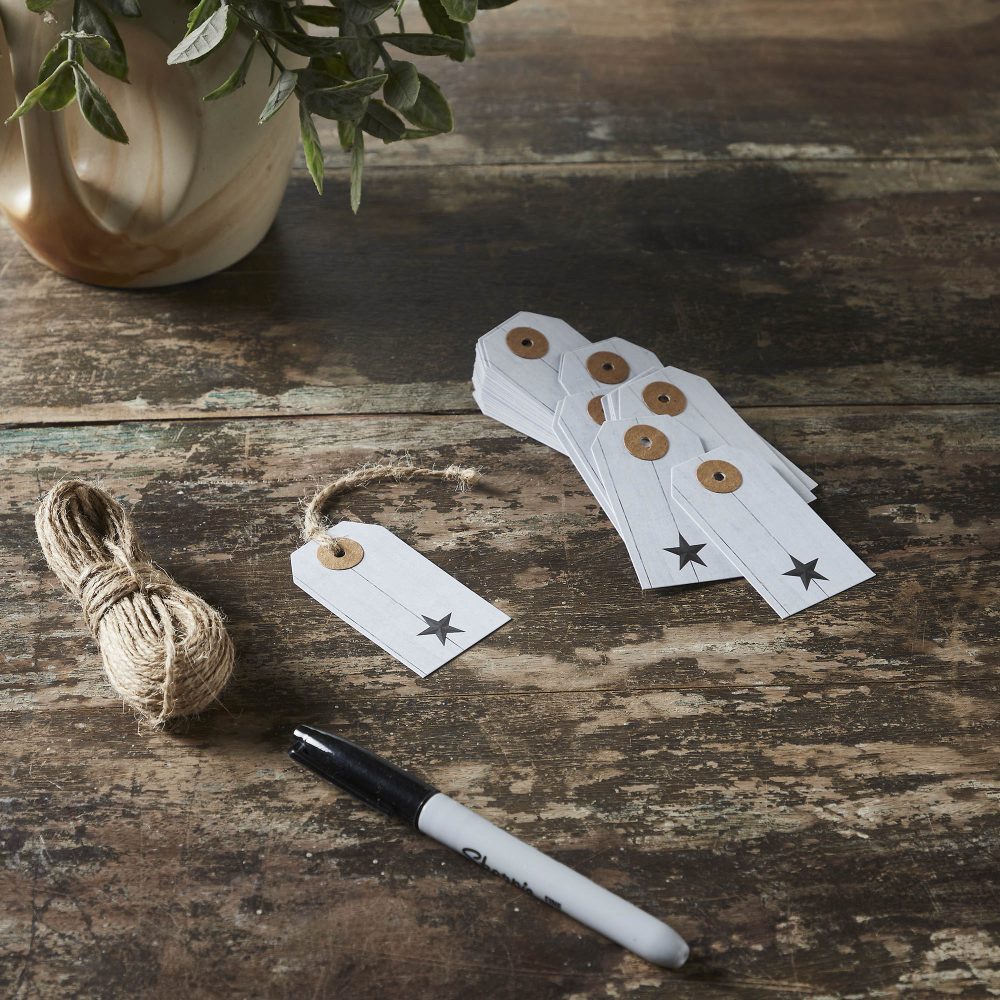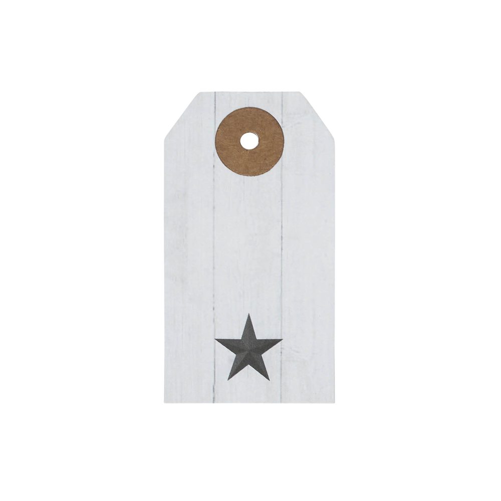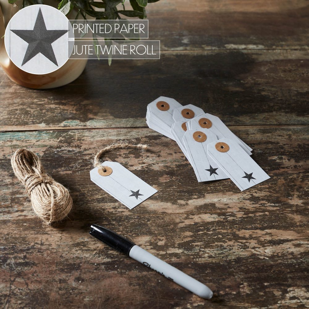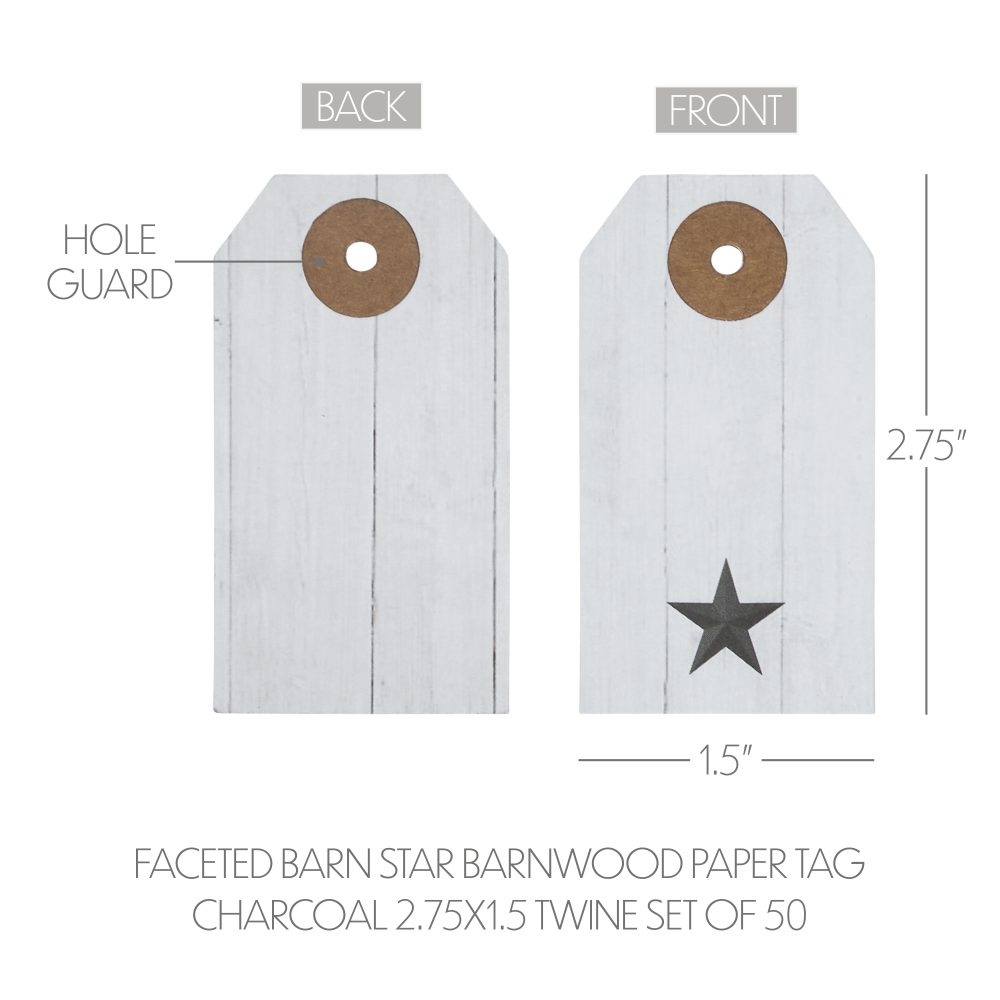 - Patriotic Faceted Barn Star Barnwood Paper Tag Set: The VHC Brands Patriotic Faceted Barn Star Barnwood Paper Tag Set features 50 tags, each measuring 2.75×1.5, offering a charming addition to your Independence Day decor. Crafted from barnwood-inspired paper, these tags showcase a charcoal printed barn star design.