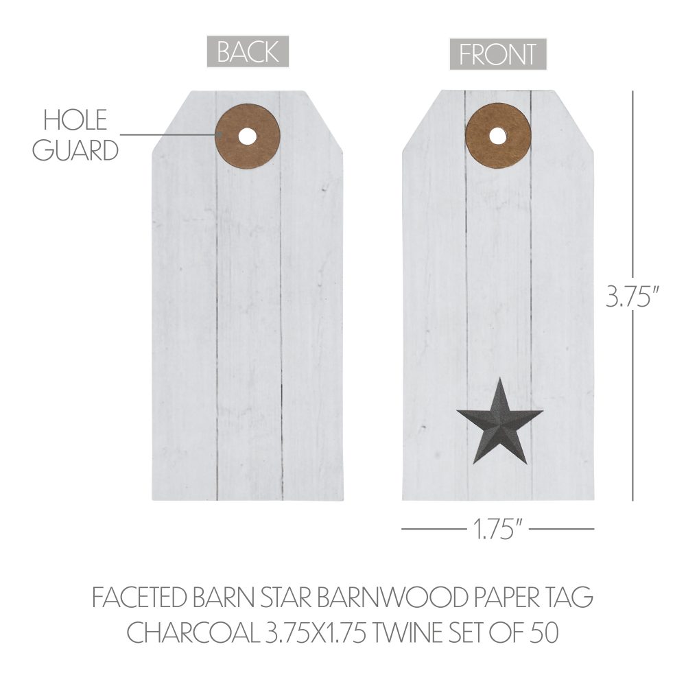 - Patriotic Faceted Barn Star Barnwood Paper Tag Set: The VHC Brands Patriotic Faceted Barn Star Barnwood Paper Tag Set includes 50 tags, each measuring 3.75×1.75, providing a charming addition to your Independence Day decor. Crafted from barnwood-inspired paper, these tags showcase a charcoal printed barn star design.