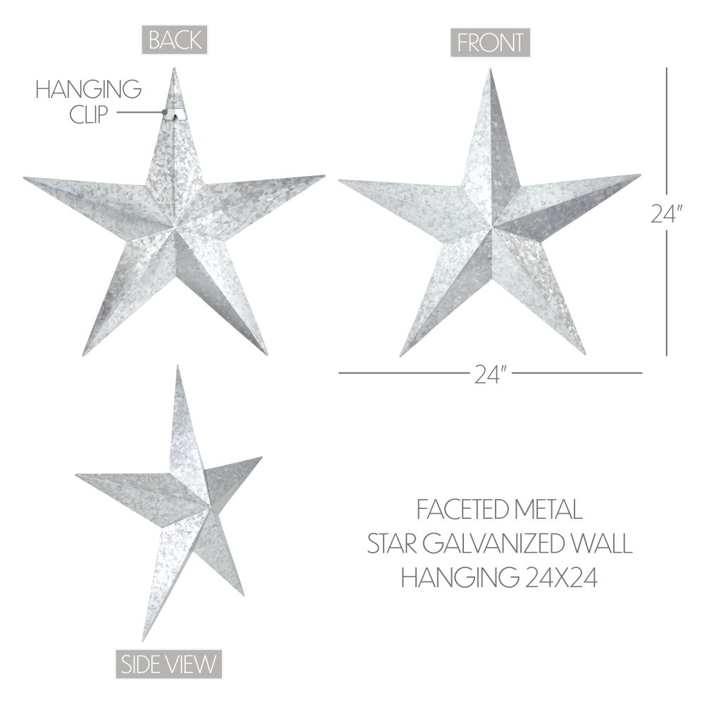 - Metal Wall Hanging: The VHC Brands Patriotic Faceted Metal Star Galvanized Wall Hanging, generously sized at 24×24, is a captivating and durable decorative piece designed to enhance your home with patriotic charm.