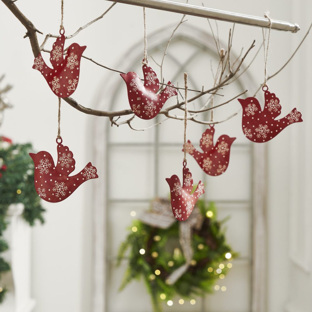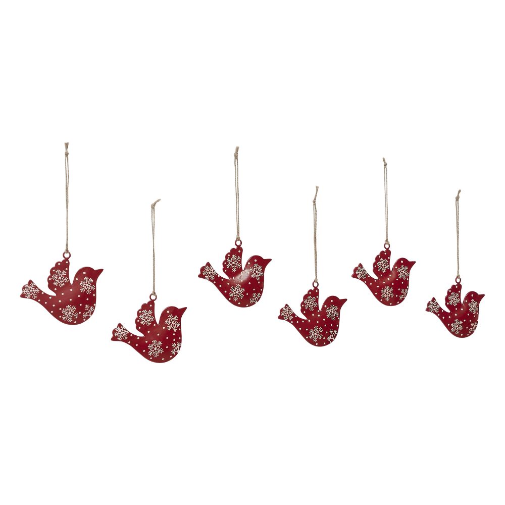 Add a cozy, woodland-inspired accent to your holiday decor with the VHC Brands Falling Snow Bird Metal Ornament Set of 6. Crafted from durable iron, each bird-shaped ornament is painted in a rich dark red and adorned with delicate white snowflakes for a charming winter look. A rustic twine hanger adds to the primitive, handcrafted feel, making these ornaments a perfect fit for traditional or country-style Christmas decorating. These festive bird ornaments are ideal for hanging on Christmas trees, accenting garlands and wreaths, or incorporating into tabletop and mantel displays. The combination of a warm color palette and nature-inspired design brings a sense of peace and seasonal cheer to any setting. Lightweight and easy to display, they offer flexibility for a variety of creative arrangements. Perfect for use in the bathroom, bedroom, dining room, entryway, kitchen, or living room, this set of six ornaments delivers timeless charm and rustic elegance. Whether used as a group or scattered throughout your space, they create a unified, welcoming holiday atmosphere. To maintain their painted finish, simply wipe clean with a soft cloth.