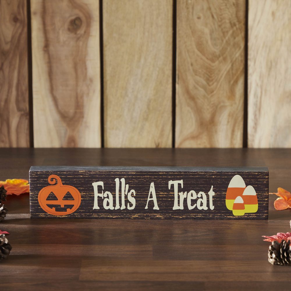 - COZY FALL ATMOSPHERE: Instantly infuse your home with heartwarming autumnal spirit and playful Halloween charm through this durable sign’s distressed ‘Fall’s A Treat’ message and whimsical seasonal accents.