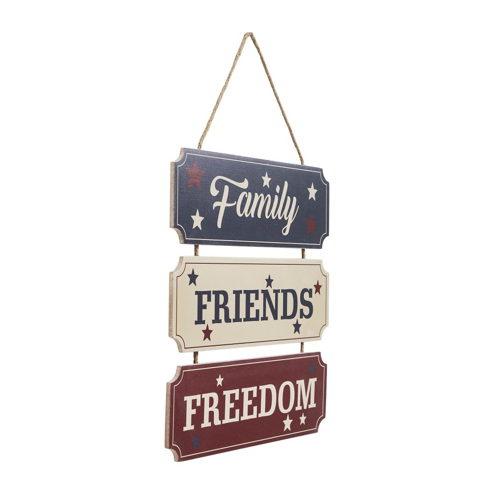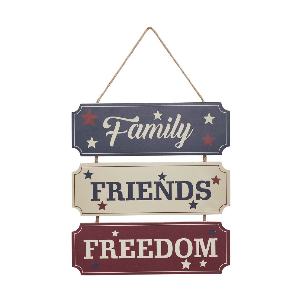 Celebrate the spirit of unity and patriotism with the VHC Brands Patriotic Family Friends Freedom MDF Wall Hanging 12x12. This beautifully crafted decorative sign features three rectangle panels, each displaying a single meaningful word: "Family," "Friends," and "Freedom." The patriotic color palette of patriot blue, red, and creme adds a vibrant yet rustic touch, while the rope hanger ties the design together for a charming farmhouse appeal. Perfect for enhancing any space, this wall hanging fits beautifully in living rooms, dining rooms, kitchens, bedrooms, bathrooms, or entryways. Its Americana-inspired design and timeless sentiment make it ideal for Independence Day celebrations while seamlessly blending into your year-round rustic decor. Whether hung on a wall, door, or accent space, the sign adds warmth and character, reminding you of the values that matter most. Maintaining the VHC Brands Patriotic Family Friends Freedom Wall Hanging is effortless-just wipe it clean with a soft cloth to keep its digital print and vibrant colors looking fresh. With its quality craftsmanship and heartfelt design, this piece is more than just decor-it's a celebration of the connections and freedoms we cherish. Display it proudly to showcase your love for family, friends, and the patriotic spirit.