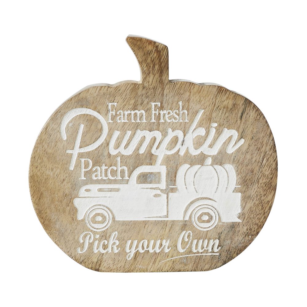 - ACCENTUATE YOUR AUTUMN: Crafted from smooth tropical wood, this delightful pumpkin-shaped tabletop sign features an inviting wood brown and soft creme palette, detailed with a beautifully carved graphic and hand-painted “Farm Fresh Pumpkin Patch, Pick Your Own” inscription, including a vintage pickup truck laden with pumpkins; measuring a perfect 6.25″ W x 6″ H x 1.25″ D, it seamlessly adds rustic farmhouse charm to any fall display.