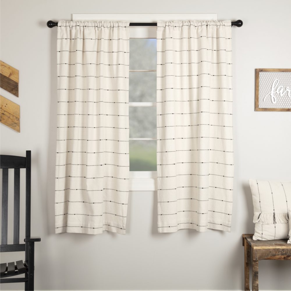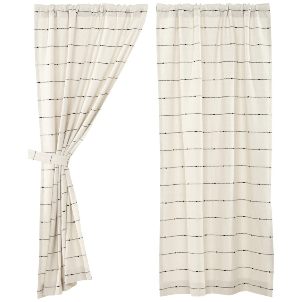- FARMHOUSE NEUTRAL: Panel set consists of horizontal, knotted stripe pattern in charcoal black on fresh creme cotton fabric; TEXTURED: Features a thicker weave for additional texture; QUALITY FINISH: Finished with our standard 3″ hem fold; OPTIONAL DISPLAY: Includes 2 matching tie-backs to pull either one side or both sides of curtain back; SINGLE FABRIC: WOVEN: Loom woven, Machine stitched