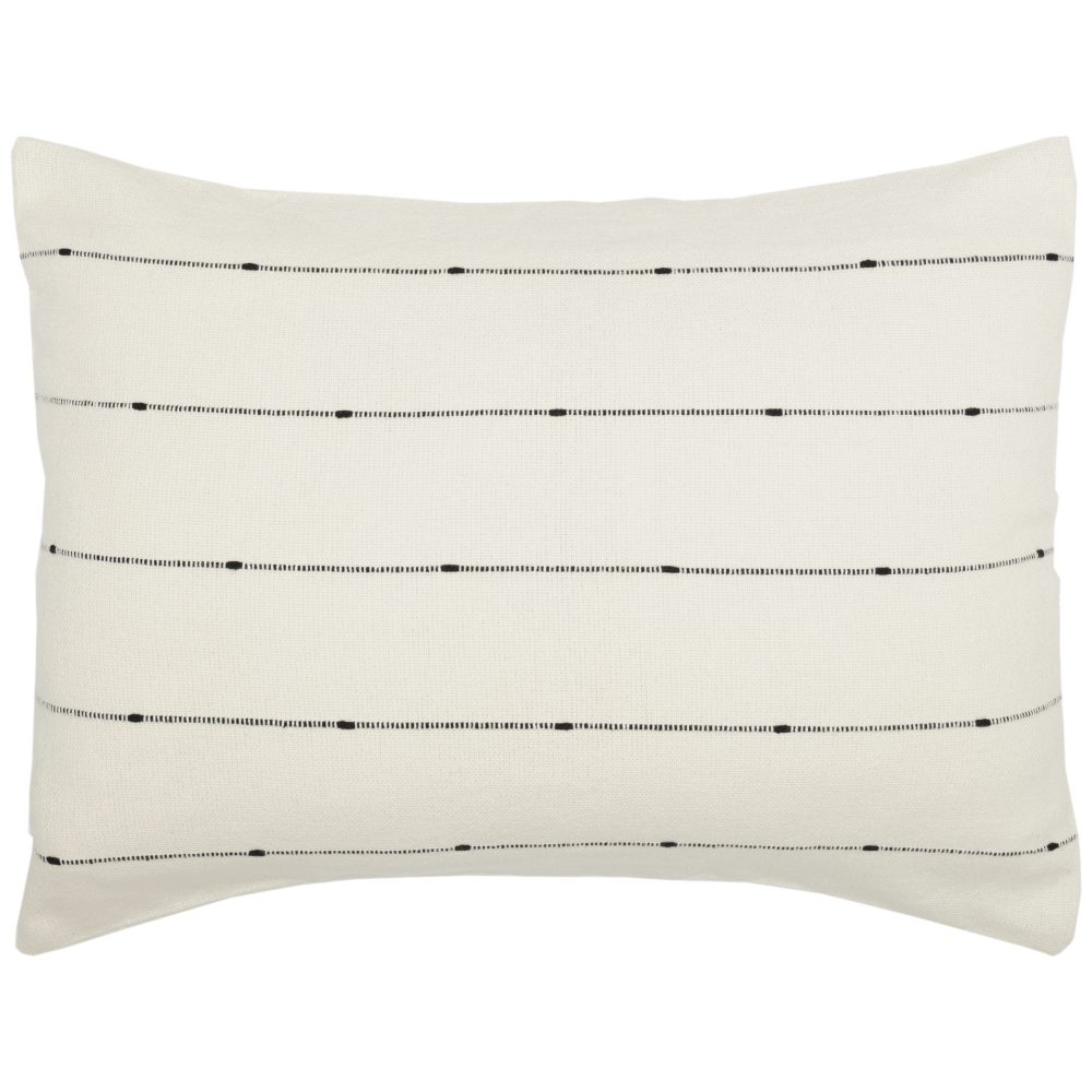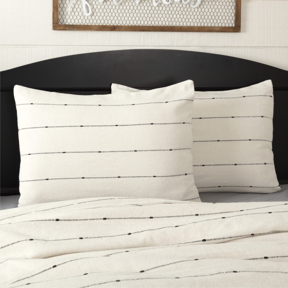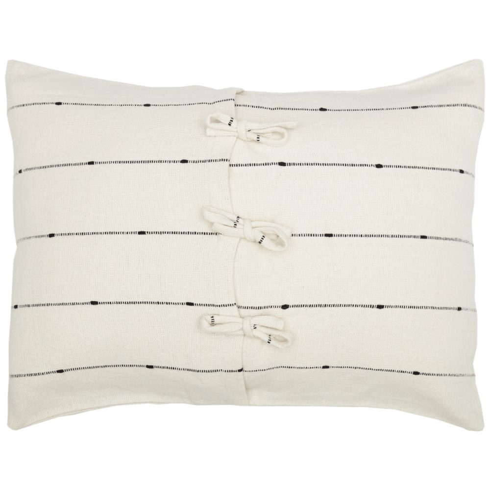 • FARMHOUSE NEUTRAL: Sham consists of horizontal, knotted stripe pattern in charcoal black on fresh creme cotton fabric; TEXTURED: Features a thicker weave for additional texture; CLEAN DESIGN: This pillow sham is finished with a simple, turned edge seam; Reverses to same as front; SECURE CLOSURE: Features 3 tie closures with 3″ overlap to conceal pillow insert; SINGLE FABRIC: WOVEN: Loom woven, Machine stitched