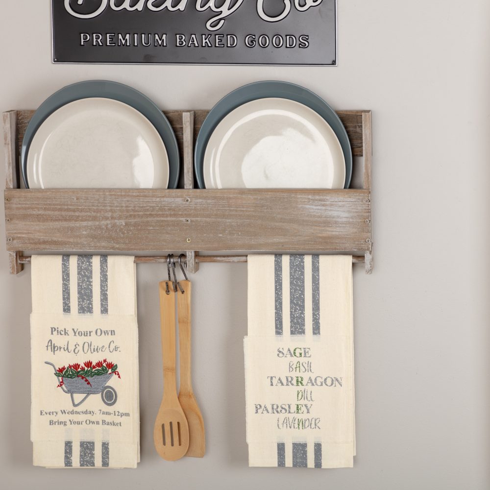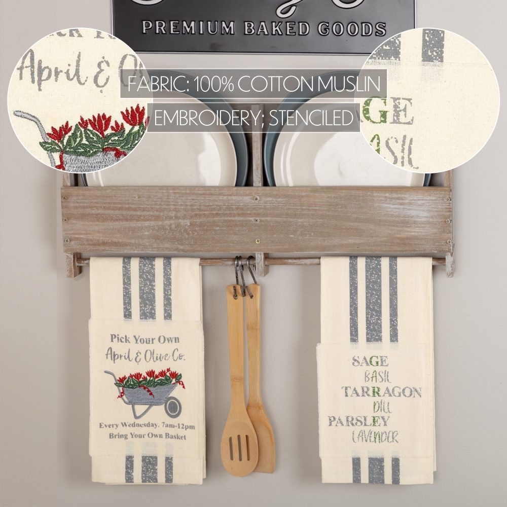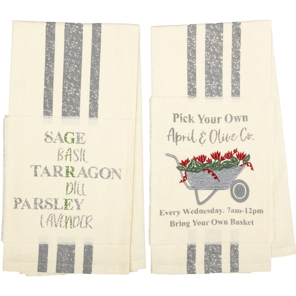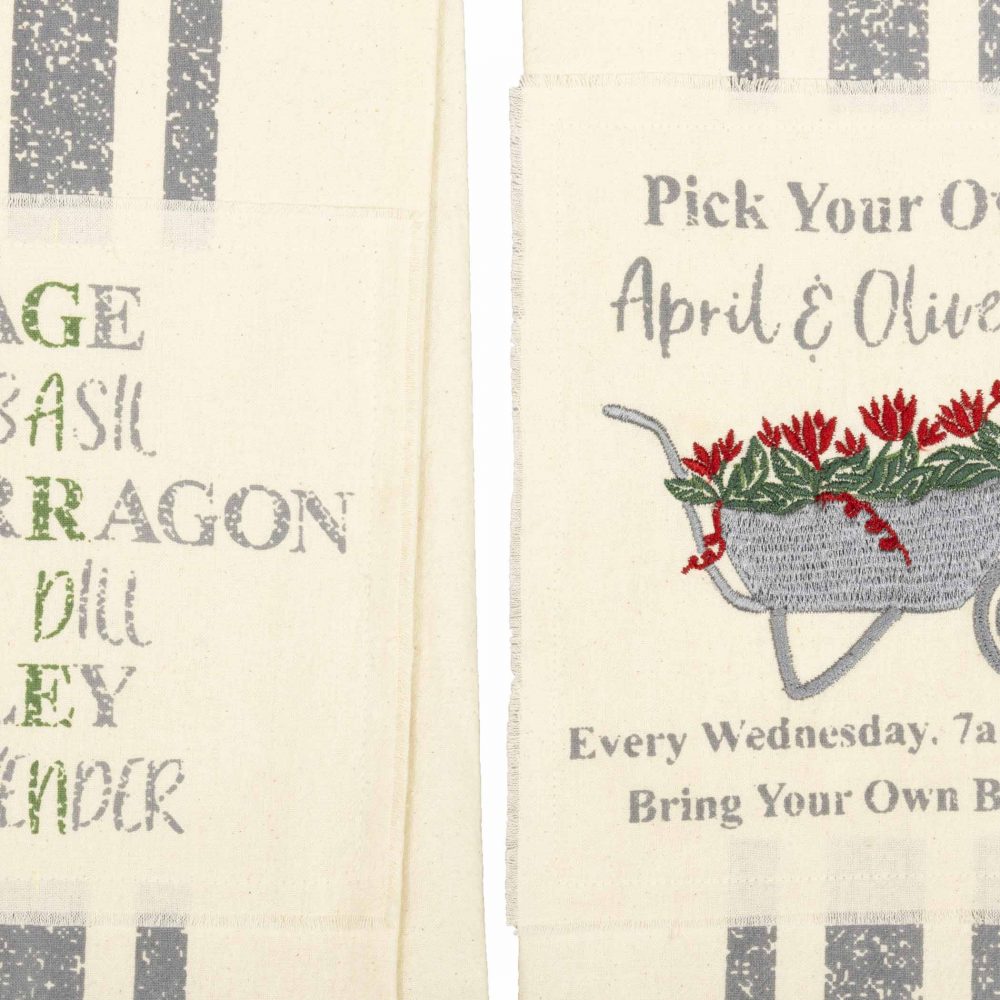 Bring playful color filled with spring and summertime sentiments to your kitchen with the Garden Wheelbarrow Unbleached Natural Muslin Tea Towel Set from our new Farmer's Market collection. With a grey wheelbarrow filled with bright red flowers on one towel and a list of herbs arranged to spell "Garden" out vertically on the other, these 19x28 tea towels provide reminders of charming greenery and herb gardens to your home. A grain sack stripe running down the middle gives each a vintage, farmhouse feel. Our kitchen towel set of two includes fabric loops for easy hanging and is crafted from cotton muslin, adding texture to your cooking area.