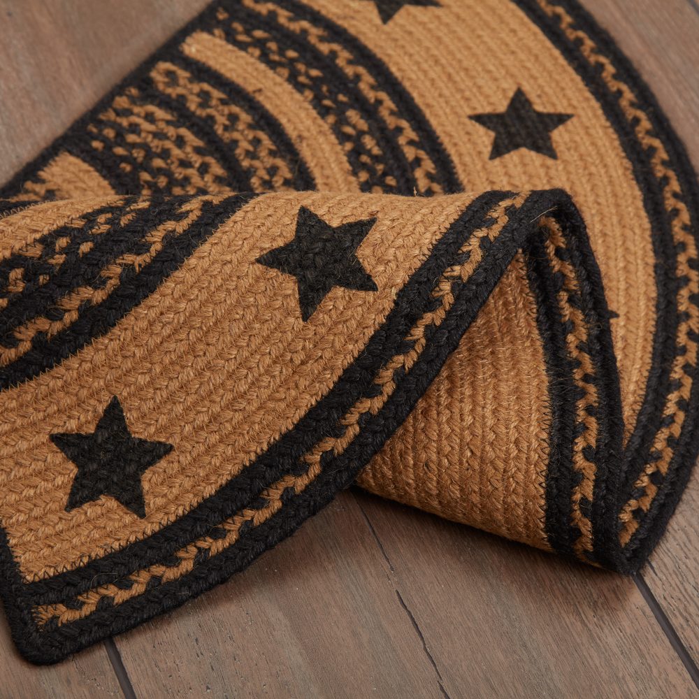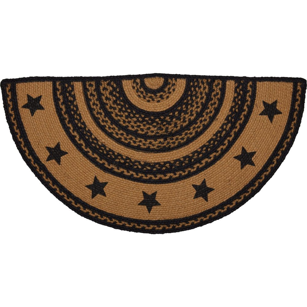 Create a warm, homey feeling with deep primitive colors in a curl-resistant jute blend that can add style and safety to both entryways and kitchens. The Farmhouse Jute Rug measures 16.5x33 inches and features a classic half circle shape and tight braids constructed with a durable jute blend. The special blend relaxes faster and stays flat. Features a blend of country black and dark tan with stenciled stars for a dark, rustic look that complements a wide array of country farmhouse decor.