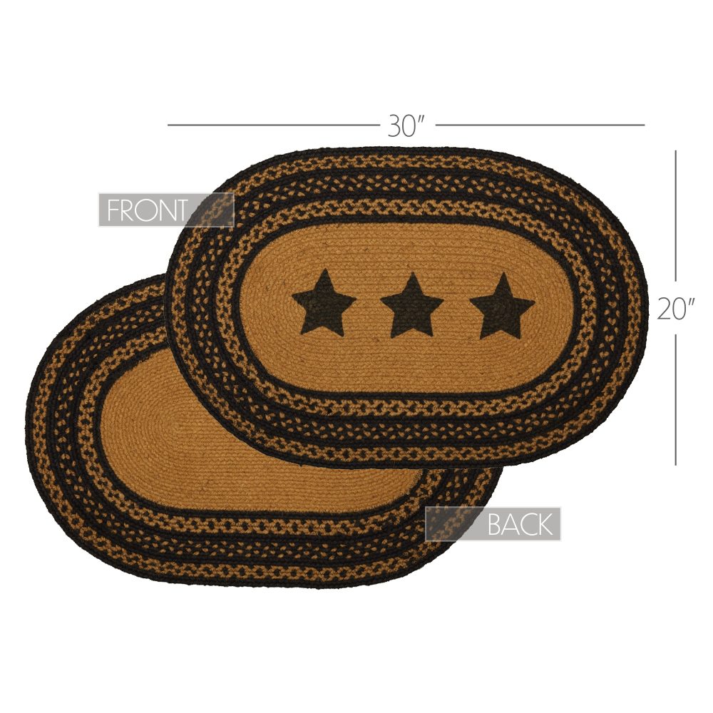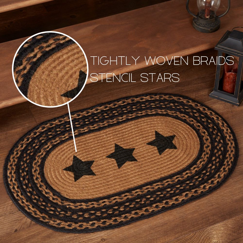 Create a warm, homey feeling with deep primitive colors in a curl-resistant jute blend that adds style and safety anywhere a small accent rug is needed. The Farmhouse Jute Rug measures 20x30 inches and features a classic oval shape and tight braids constructed with a durable jute blend. The special blend relaxes faster and stays flat. Features a blend of country black and dark tan with stenciled stars for a dark, rustic look that complements a wide array of country farmhouse decor.