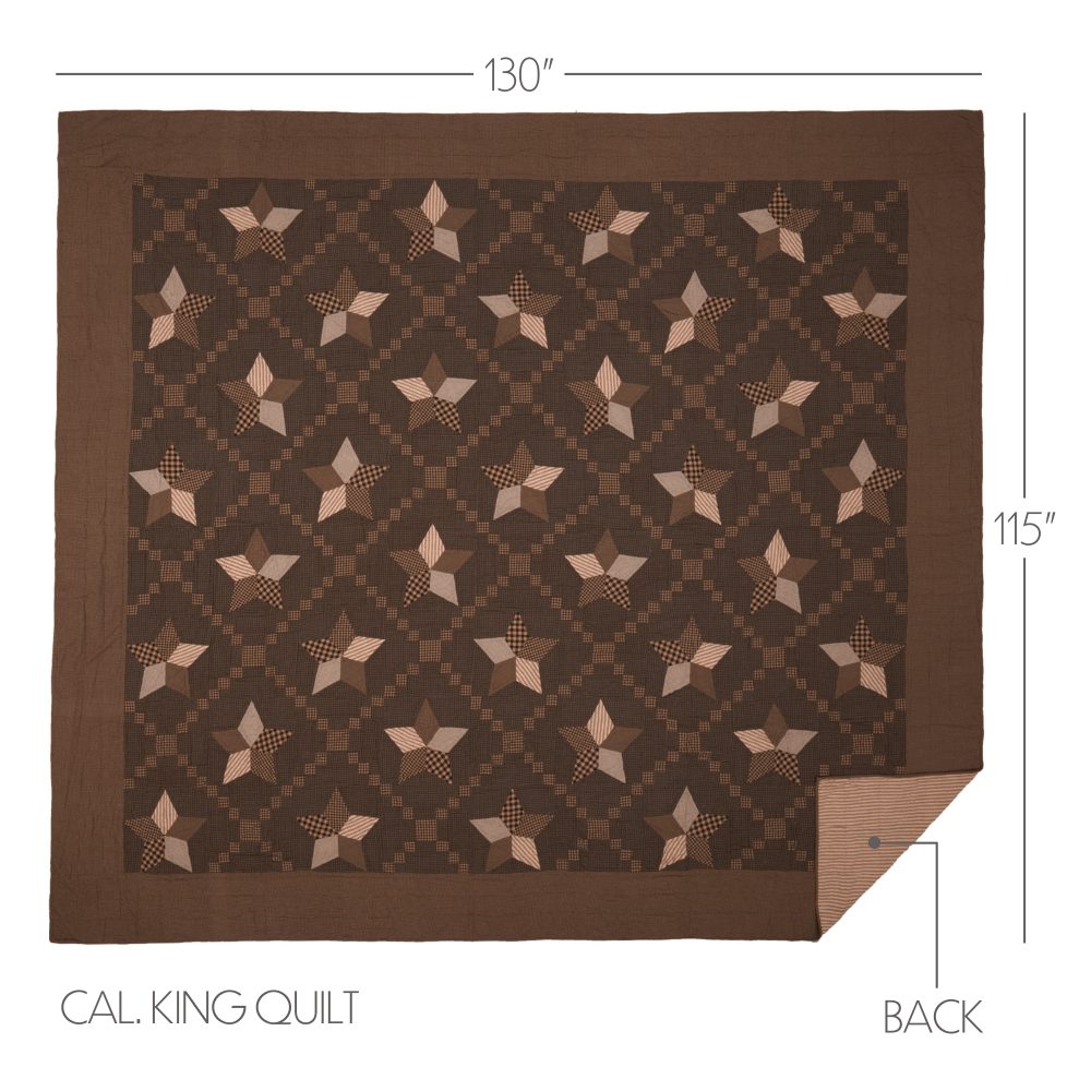 Update any bedroom in your home with a touch of sophistication and classic country style. The Farmhouse Star California King Quilt measures 130x115 inches and features large 5 point stars on a black micro plaid, crisscrossed with a traditional Irish chain in black and khaki check patches. The beautiful array of unique patterns add depth and dimension that effortlessly catches your eye when you walk into the room. The reverse side adds a touch of farmhouse charm with charcoal and dark creme ticking stripes.