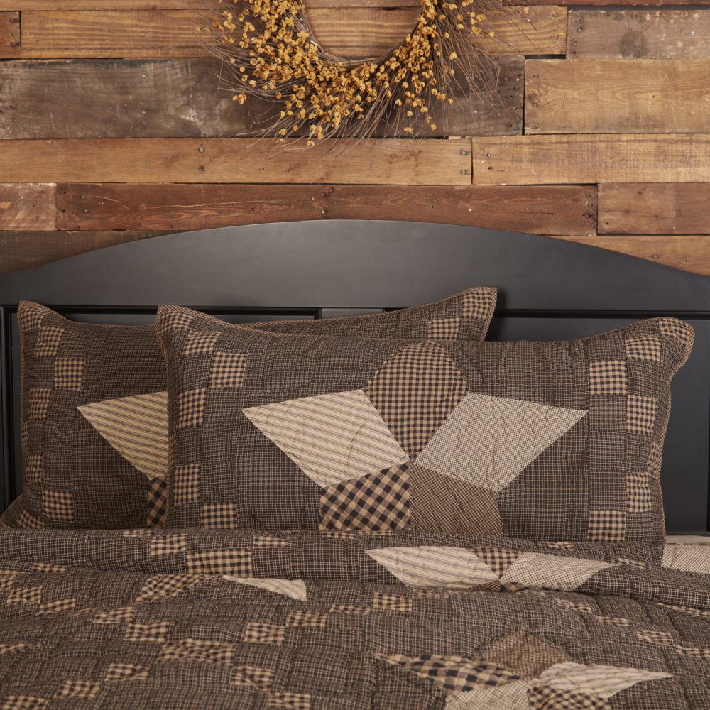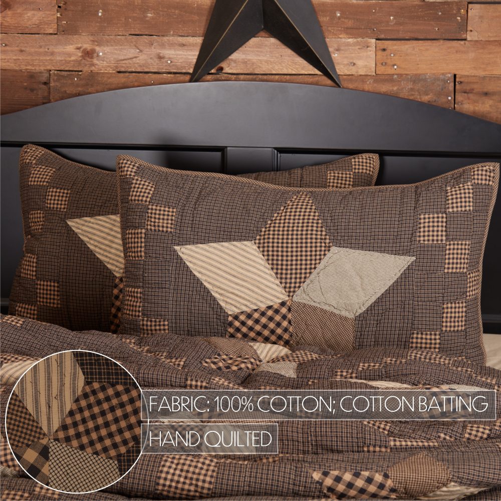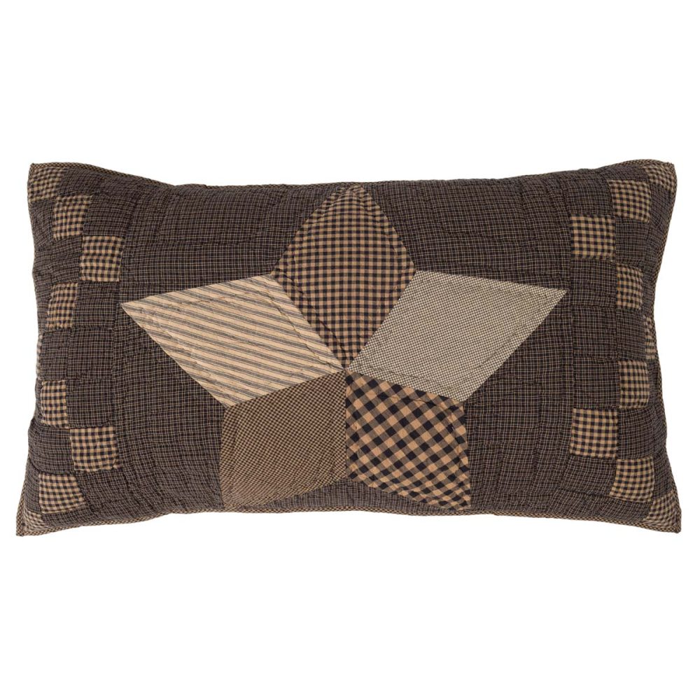 Add warm, cozy look to your traditional country decor with natural tones of brown and black. The Farmhouse Star Quilted King Sham measures 21x37 inches and features a quilted design with a patchwork star surrounded by blocks in varying patterns of microchecks and gingham for a vintage farmhouse feel. Add it to your bedding for warmth and style that transforms your space with a classic primitive country look. Machine washable and iron safe. Includes button-style closures for easy removal and reverses to a soft ticking stripe. Does not include fill pillow.