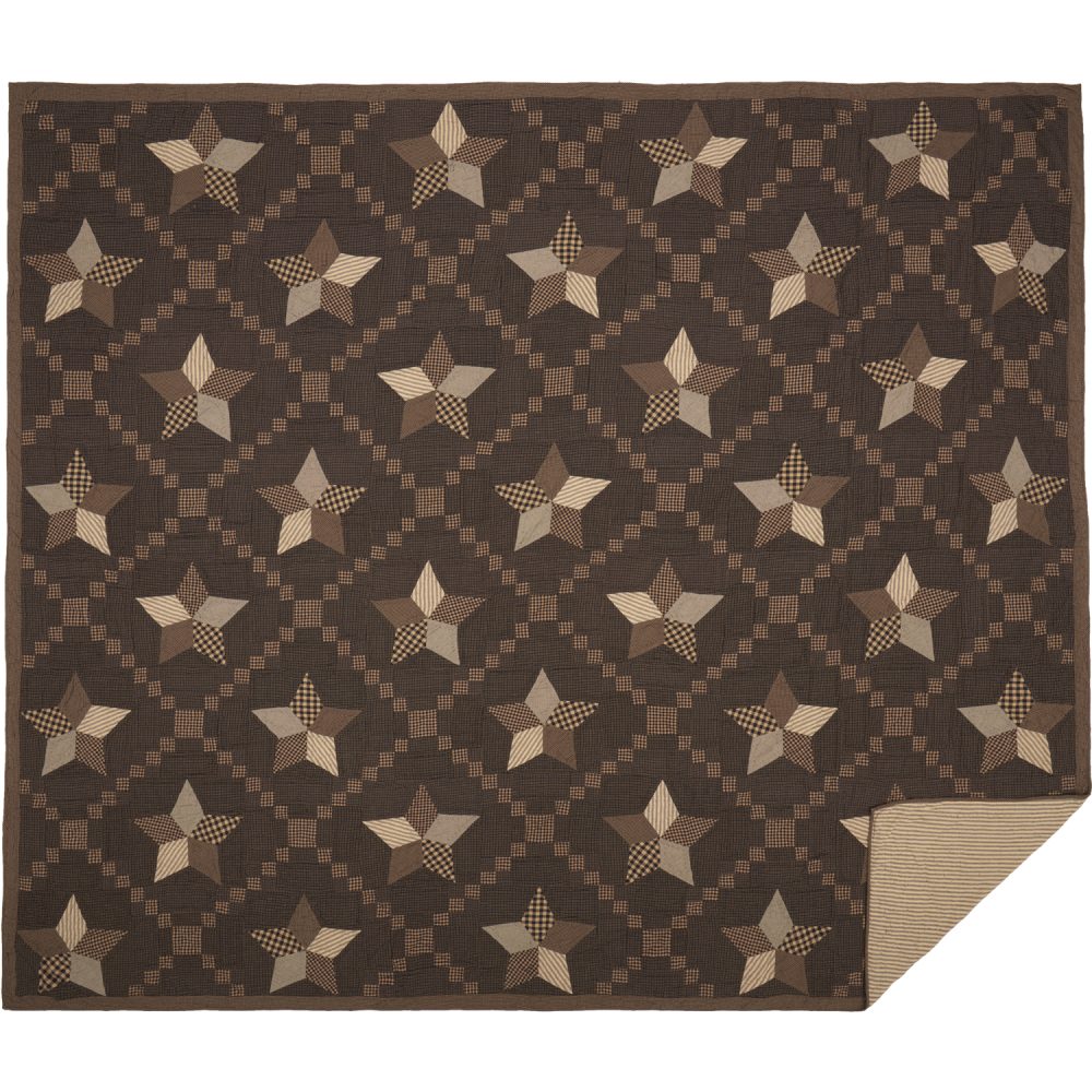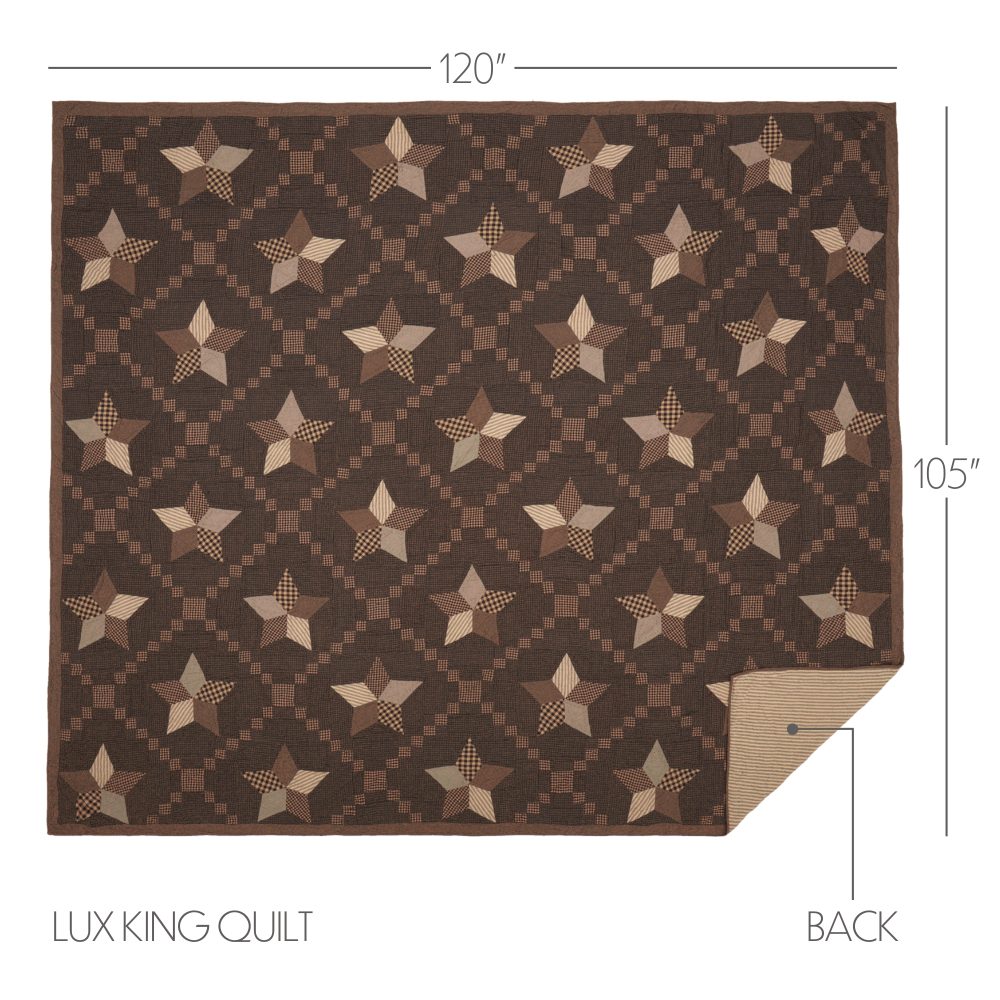 Update any bedroom in your home with a touch of sophistication and classic country style. The Farmhouse Star Luxury King Quilt measures 120x105 inches and features large 5 point stars on a black micro plaid, crisscrossed with a traditional Irish chain in black and khaki check patches. The beautiful array of unique patterns add depth and dimension that effortlessly catches your eye when you walk into the room. The reverse side adds a touch of farmhouse charm with charcoal and dark creme ticking stripes.