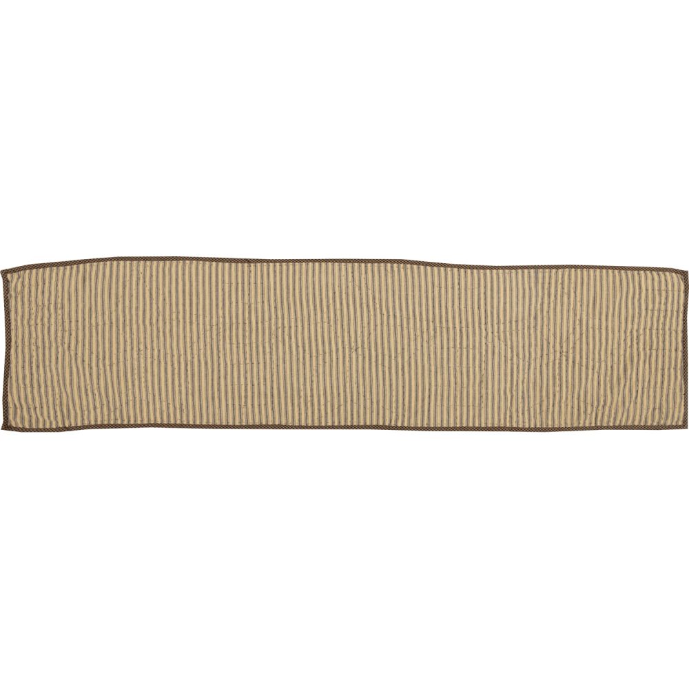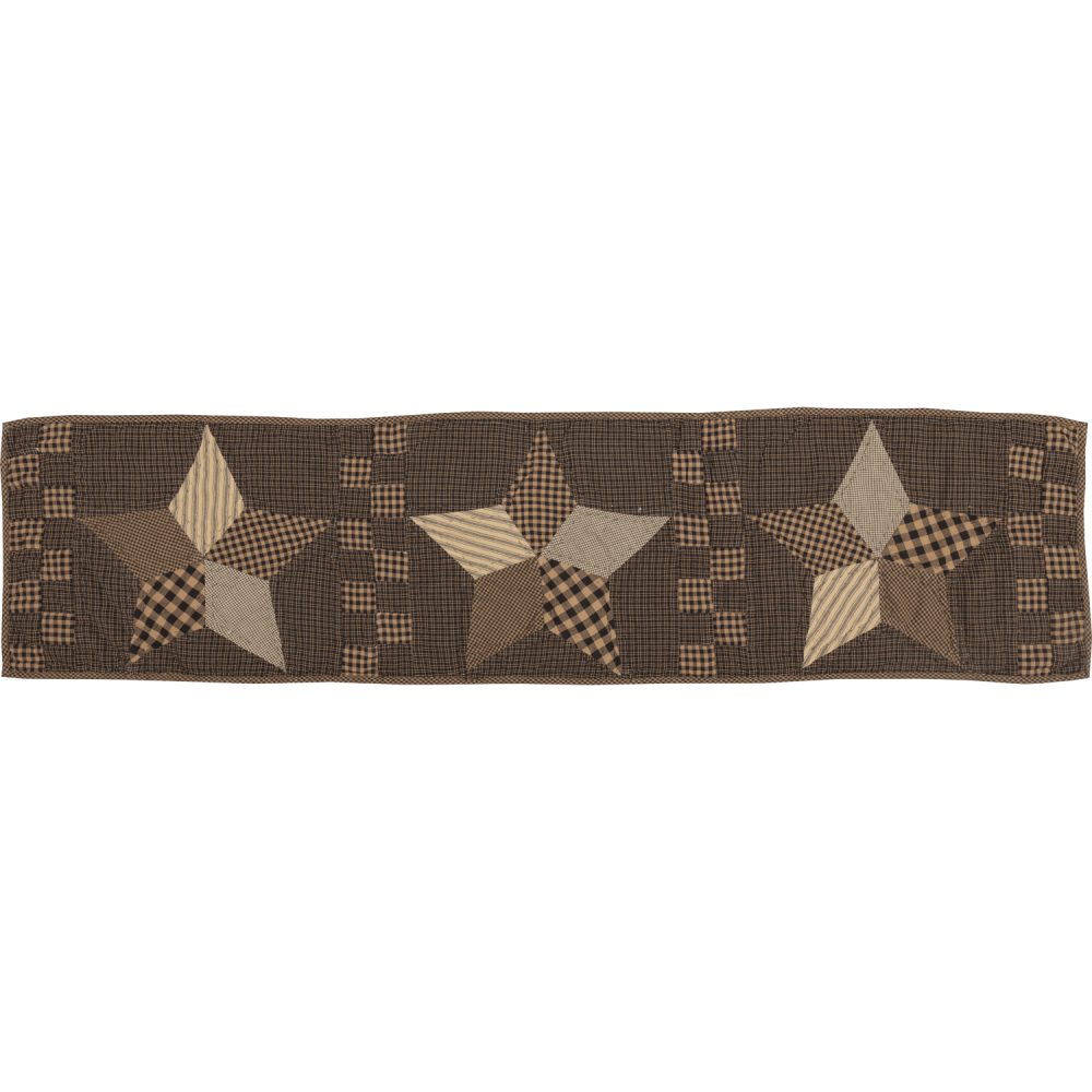 Create a warm and cozy table for friends and family to gather round with a charming classic country design. The Farmhouse Star Quilted Runner includes one table runner measuring 13x48 inches. Traditional plaid patterns in black, tan and creme colors are woven together for a timeless patchwork design. A central patchwork of stars gives each runner a primitive country feel. Reverses to a soft stripe with a vintage look. Complete your tabletop decor with other pieces from the Farmhouse Star Collection by VHC for classic country farmhouse style.