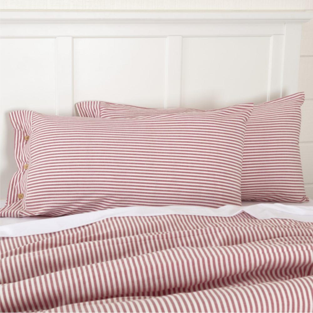 - Horizontal woven barn red ticking stripe on antique white base; Opening end trimmed in the same stripe fabric but running vertically; Turned edge seam; Reverses to same as front; Features 3 wooden button closures on end plus 1 spare hidden button with 3″ overlap to conceal pillow insert; Single fabric: Machine stitched