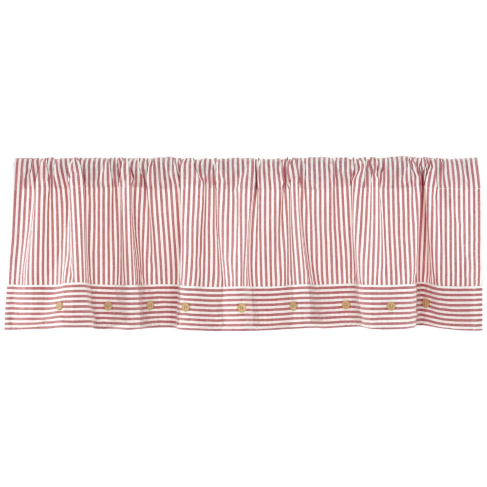 Imagine a breezy, farmhouse-style kitchen with a charming Farmhouse Ticking Red Valance glowing in the morning light. Made from 100% cotton, it's soft to touch and visually delightful. This valance, in Antique White and Barn Red, evokes nostalgic summer days. With unique button details and hanging loops, it offers versatile display options. Machine washable and iron-safe, it's easy to maintain. The lined white cotton invites warmth and fits perfectly with farmhouse or cottage decor. Its generous 3.25-inch rod pocket ensures easy hanging. Welcome this touch of nostalgia into your home and create new memories!