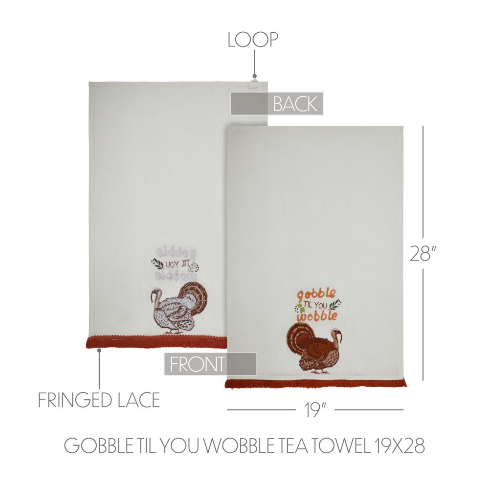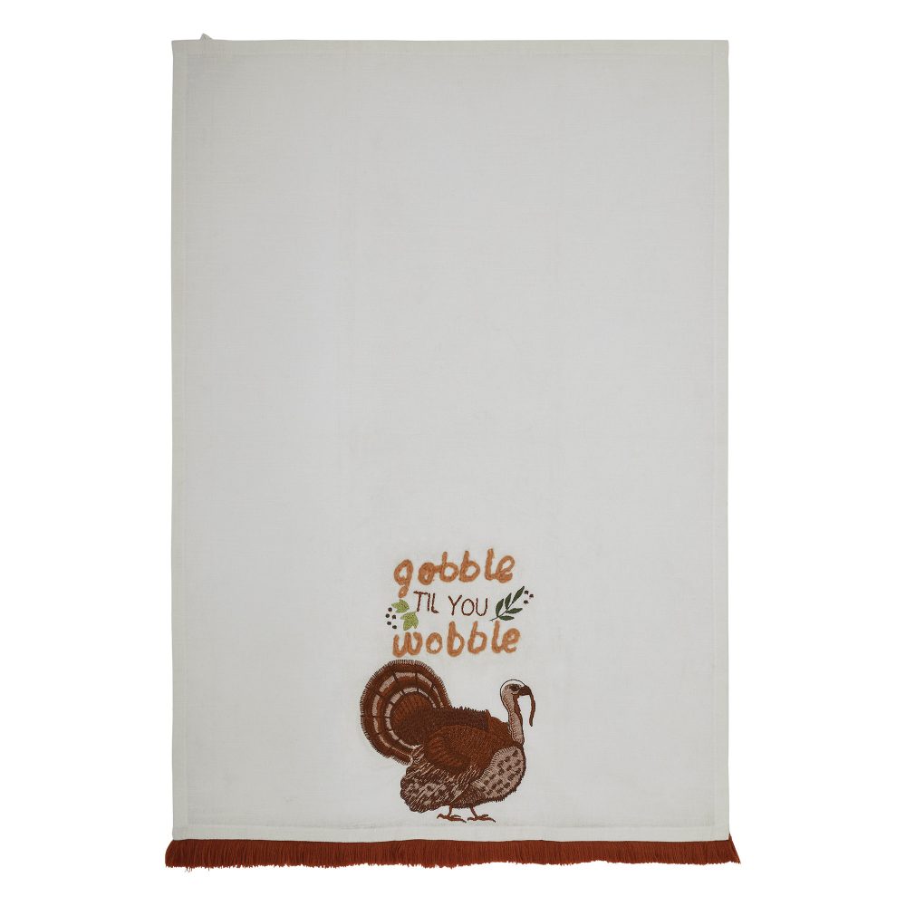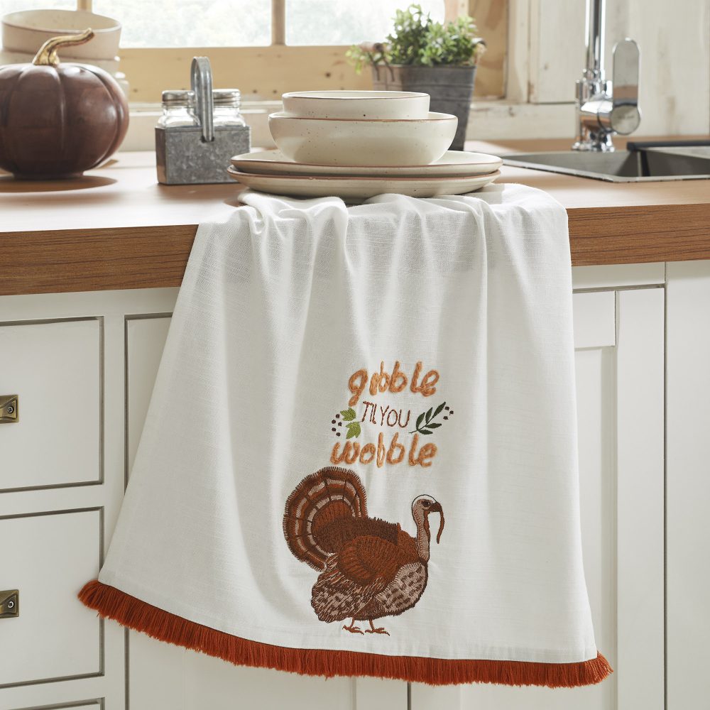 • PRODUCT FEATURES & SPECIFICATIONS: This generously sized 19×28 inch kitchen tea towel is meticulously crafted from crisp, robust, and highly absorbent cotton, adorned with a playful “Gobble Till You Wobble” design in rich nut brown, deep burgundy, and verdant green hues, perfectly complemented by a charming Thanksgiving turkey motif and a distinctive hand-finished fringed edge, ensuring lasting durability and effortless machine washable care for your festive fall and Thanksgiving decor.