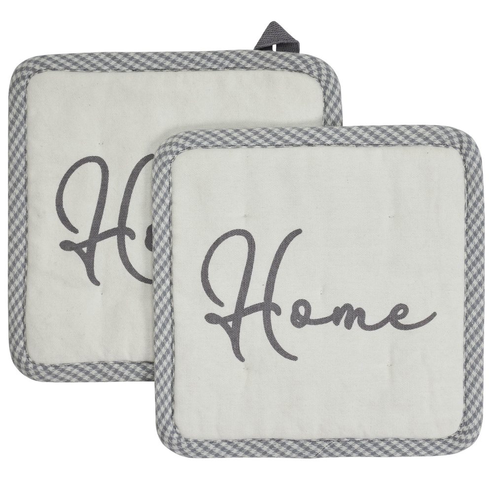 Elevate your country kitchen with the VHC Brands Cotton Pot Holder Set of 2, a charming addition to your farmhouse-inspired culinary space. Crafted with meticulous attention to detail, this set of 2 square 8x8-inch pot holders embodies the essence of rustic charm, featuring a soft white with grey "Home" inspired by the Finders Keepers Collection. These pot holders are not only stylish but also heat-resistant, providing you with the perfect combination of form and function for your cooking needs. The textured design adds a touch of rustic country appeal to your kitchen, making it an ideal choice for those who appreciate the warmth and character of farmhouse-inspired accents. The set comes in a classic soft white and grey tone, seamlessly blending with your decor and adding a timeless country touch to your culinary environment. Whether you're preparing a home-cooked meal or simply adding accents to your kitchen, the VHC Brands Cotton Pot Holder Set of 2 is a welcoming addition that beautifully reflects the cozy and inviting atmosphere of farmhouse and country-style living.