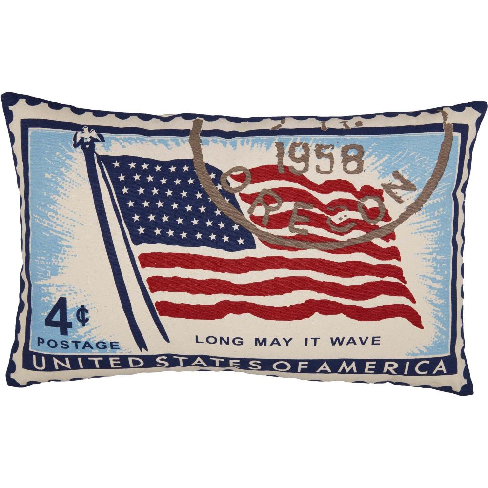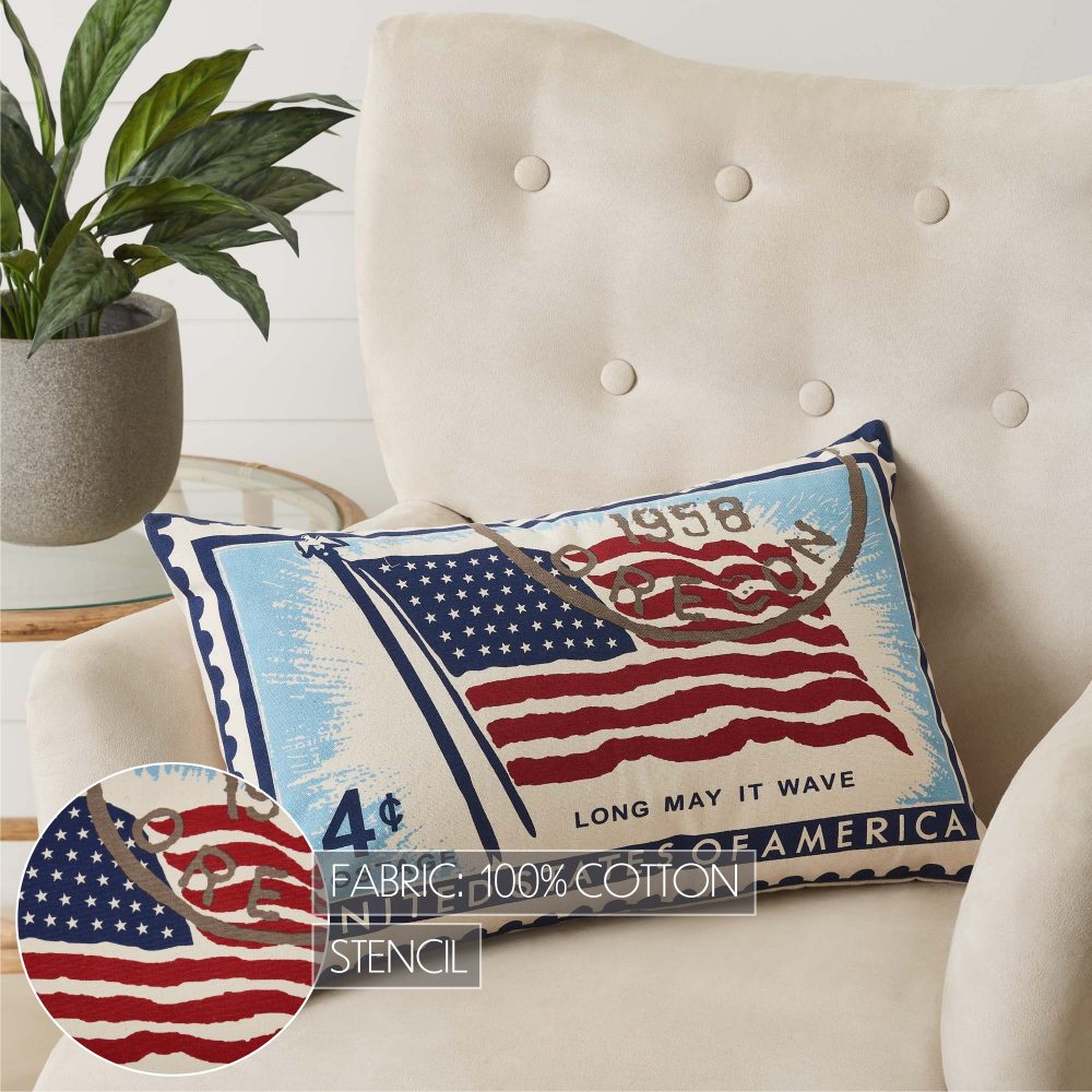 Decorate your living room furniture with star-spangled vintage charm. Our Flag Stamp Pillow 14x22 proudly displays the American Flag with the inspiring words, "long may it wave" inspired by an old-world stamp. This patriotic pillow is uniquely crafted in 100% textured cotton chambray featuring classic, all-American red, white, and blue colors. Reverses to white cotton with button closures.