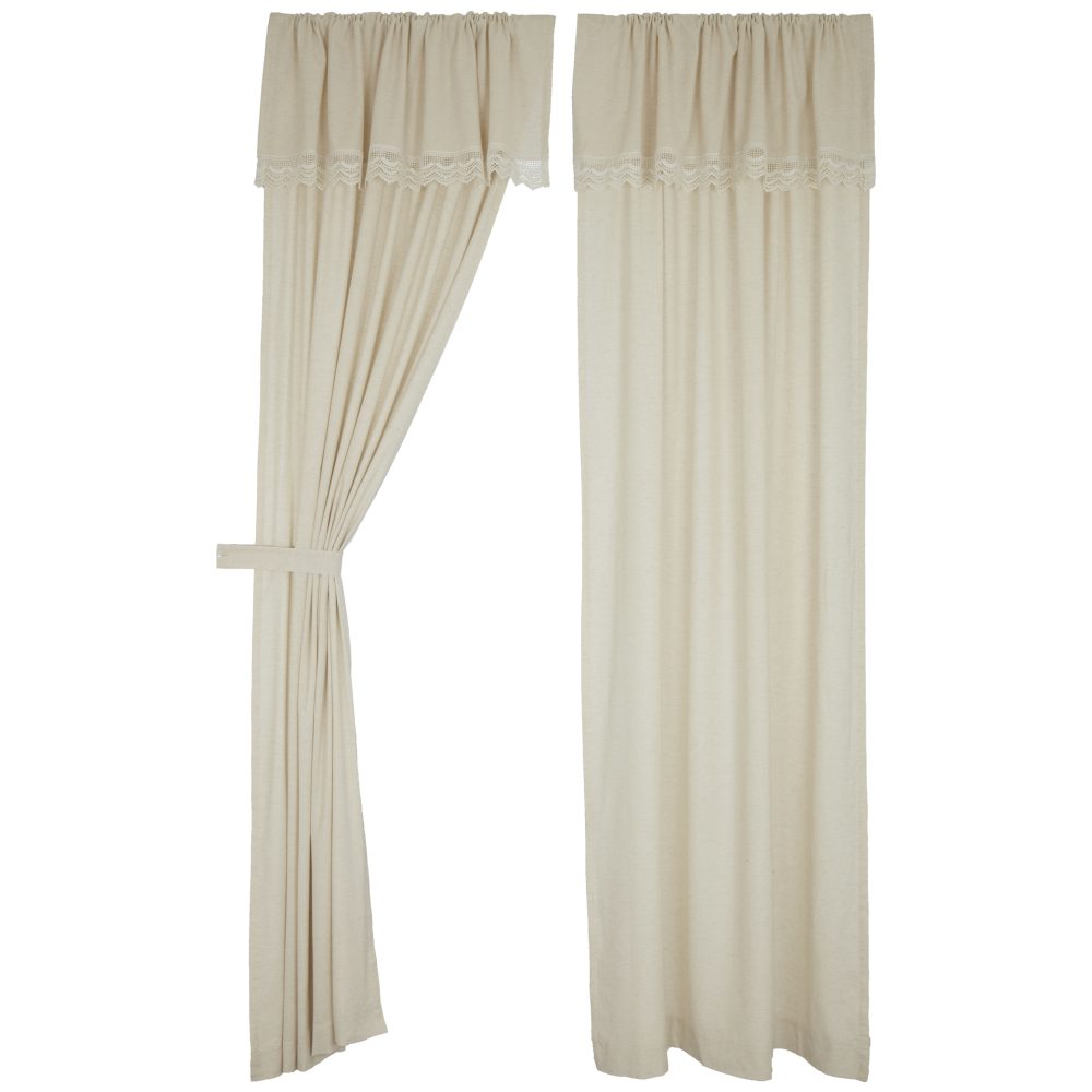 When you want to add farmhouse finesse to your home this season, why not try our Flax and Lace Collection? The design brings sophisticated simplicity and elemental elegance to your interiors, whatever your decorating style may be. The drapes with valance overlay add layers of warm, natural softness and perfectly subtle shades of cream to every setting. A delicate, airy lace detail in a lighter cream contrasts gently at the bottom of the valance, creating texture, tonal interest, and feminine detailing. The graceful, scalloped edge of the lace applique lends an additional visual aesthetic and ornate touch to the drapes. The gorgeous Flax and Lace Drapes introduce a warm and gentle layer of neutral color, along with finely-detailed lace accents that update, accentuate and soften your vintage cottage or rustic farmhouse beautifully. Set/2. Pairs perfectly with our Lydia, Brooke, and Olivia Collections.
