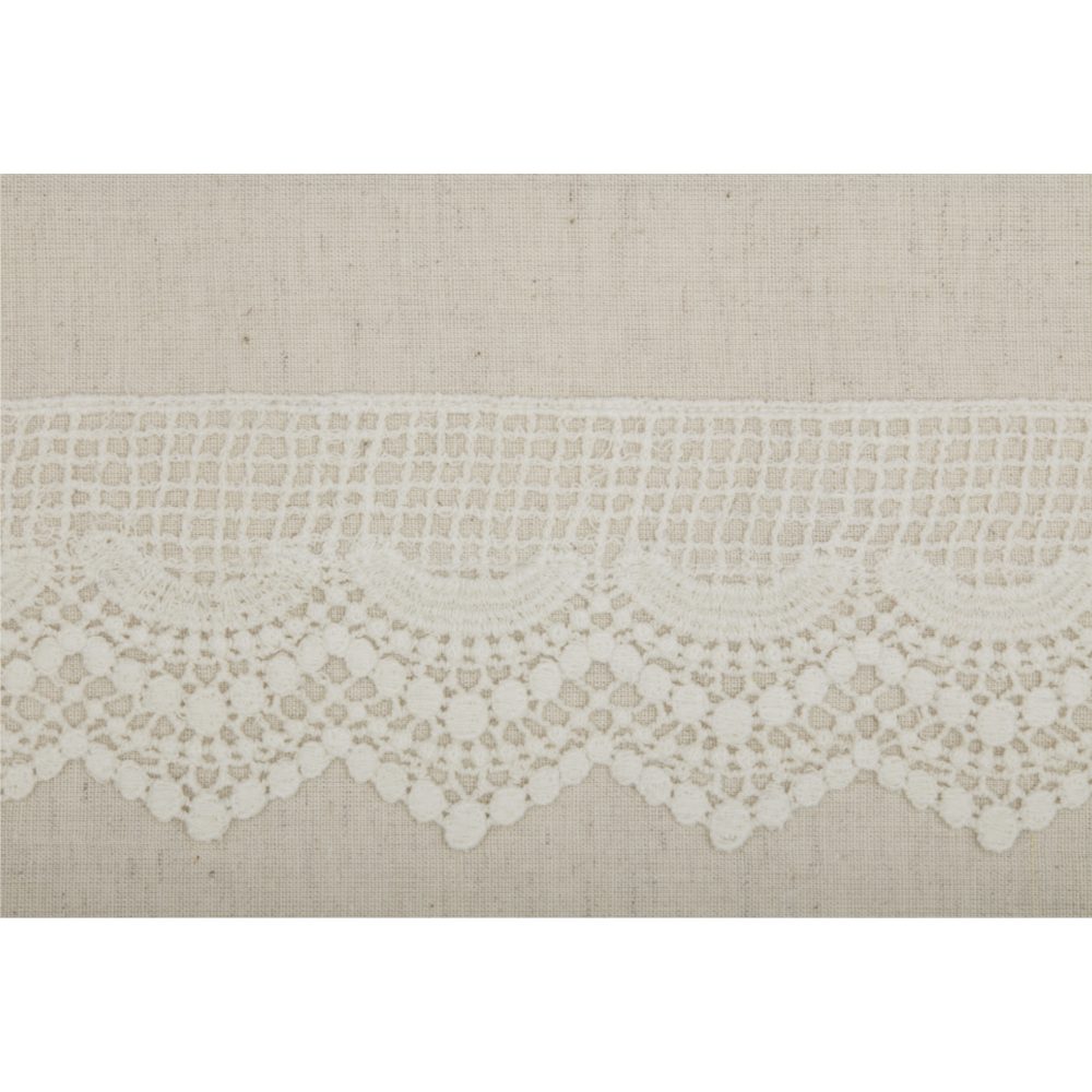 • 85% Cotton & 15% Flax in neutral Beige-Oatmeal tone. Accented with tassels and machine-crocheted scalloped lace in a lighter cream tone.