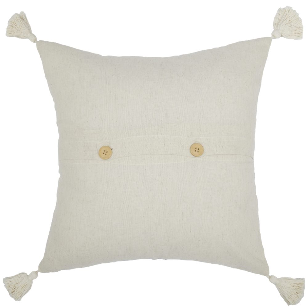 • Reverses to same fabric. Two wooden buttons on back with 3 overlay to close pillow. Four 3 tassels sewn to the corners.