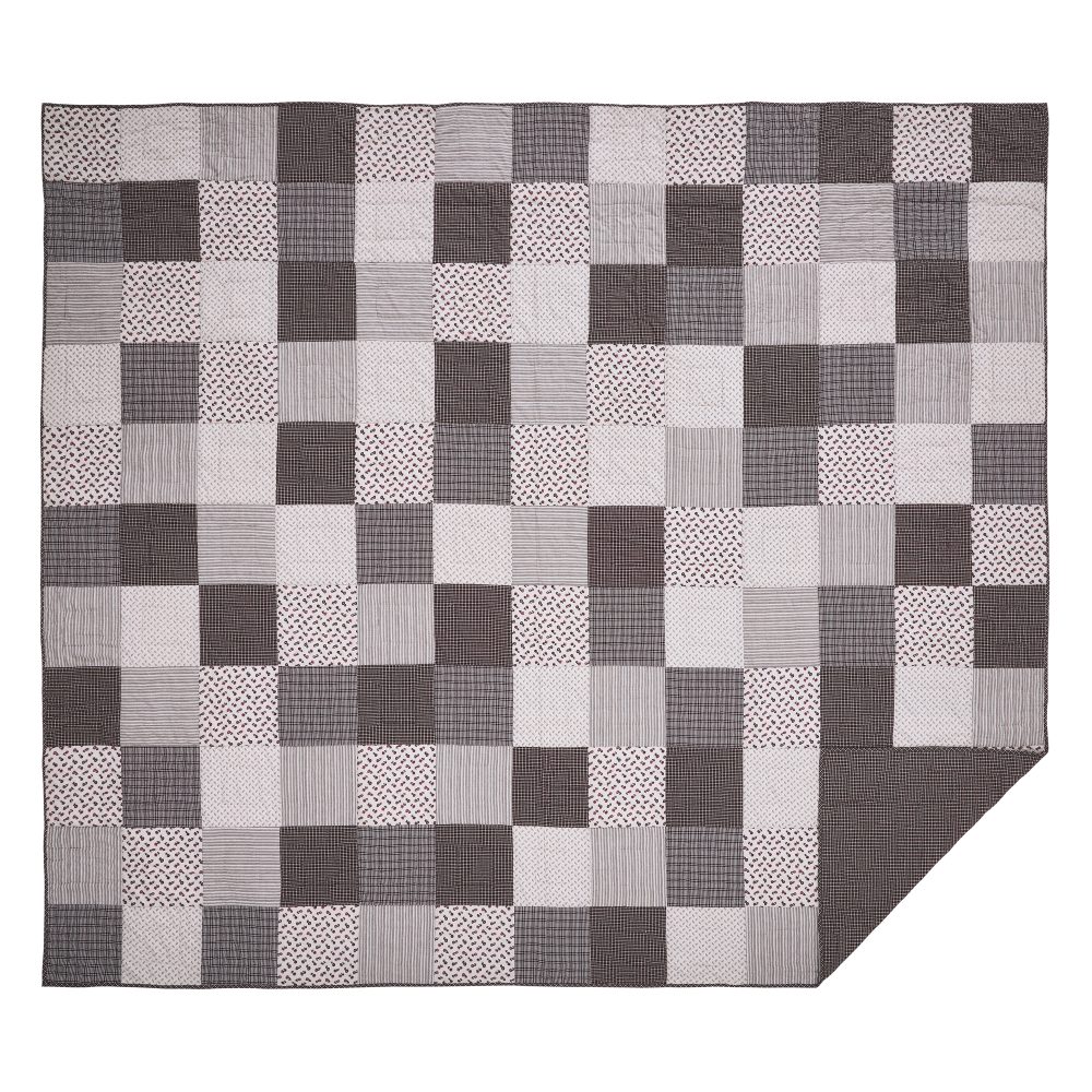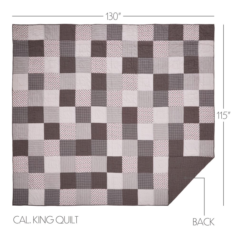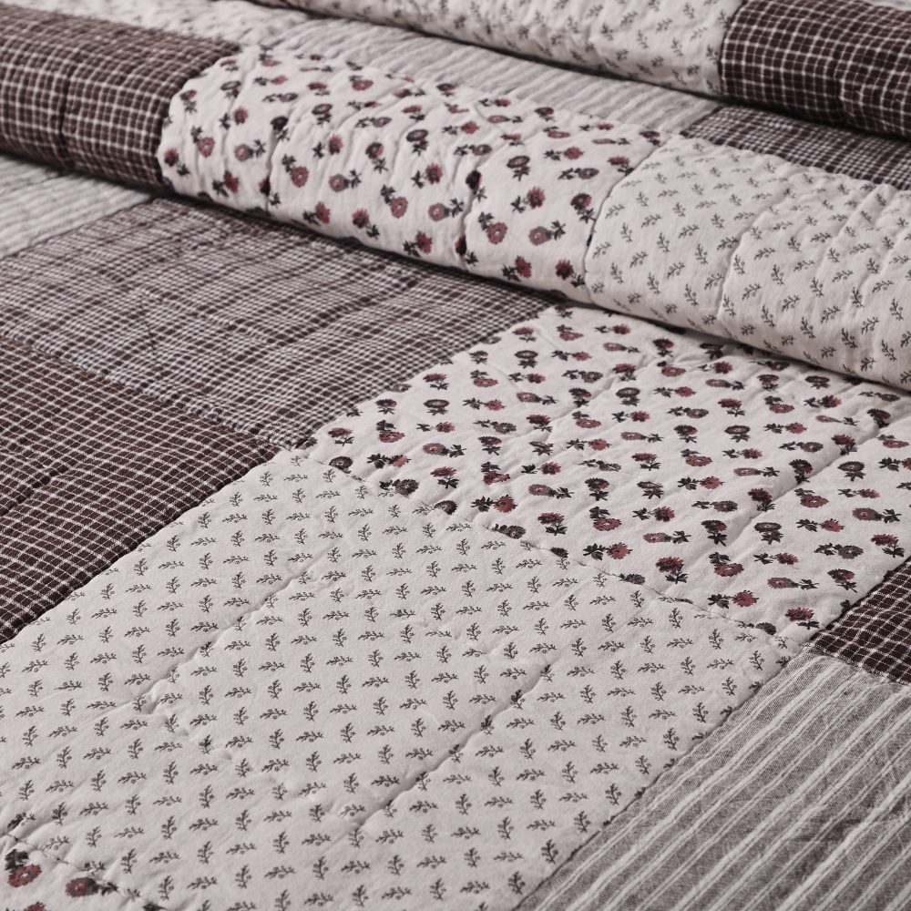 A stunning patchwork of white, coffee brown, soft taupe and splashes of mauve red enhance the look of your bedroom and add an elegant, French country look to your home. The Florette California King Quilt measures 130 by 115 inches and features square quilt blocks with a variety of ditsy florals and micro check plaids. The 100 percent cotton quilted bedspread includes warm, cotton batting and is backed by a solid coffee brown plaid. Machine washable and iron safe, this durable quilt is constructed with stitch in the ditch and echo quilting techniques for superior resistance to normal wear and tear. Coordinates with the Florette Collection by VHC for feminine, cottage-inspired style with the quality you can expect from over 20 years of happy customers.