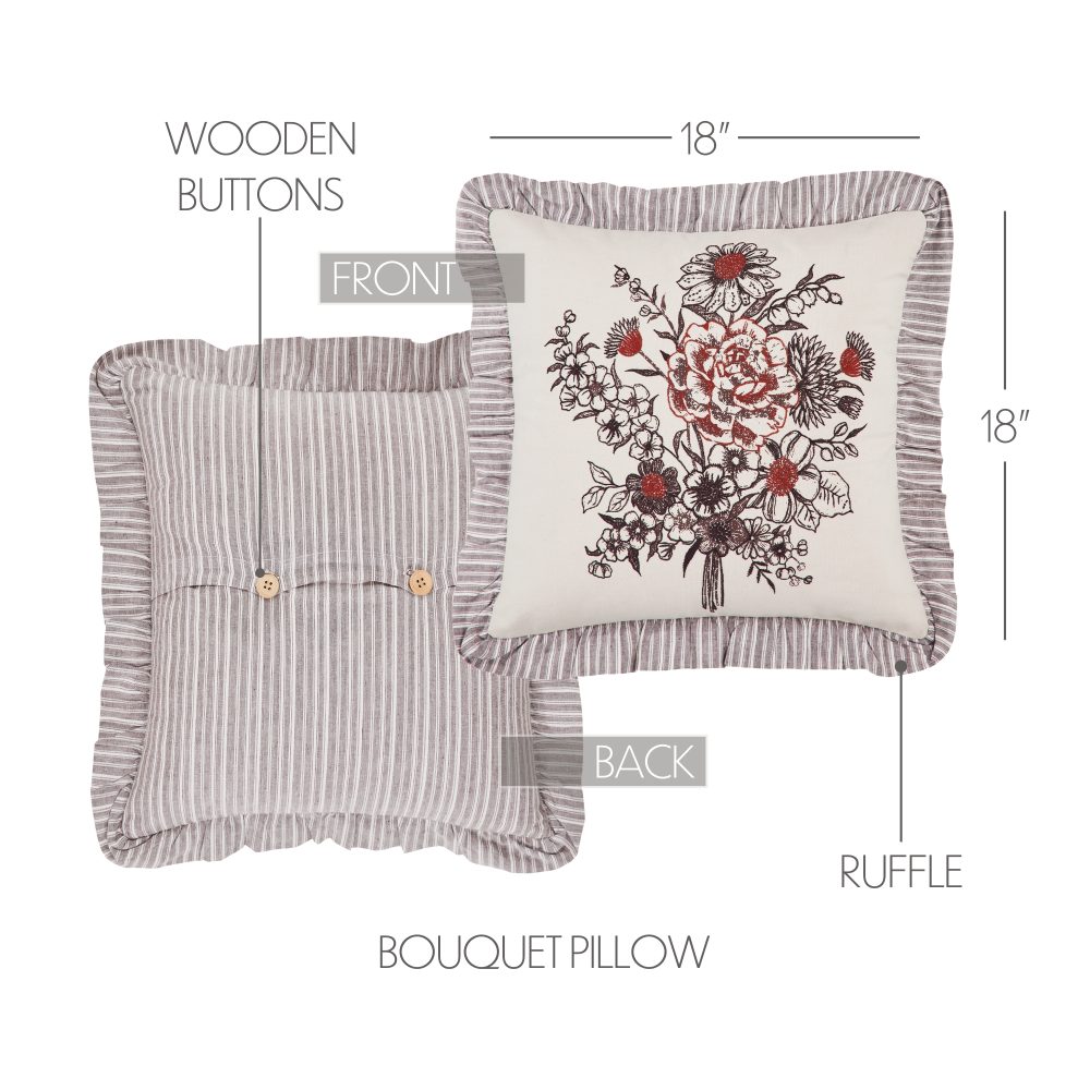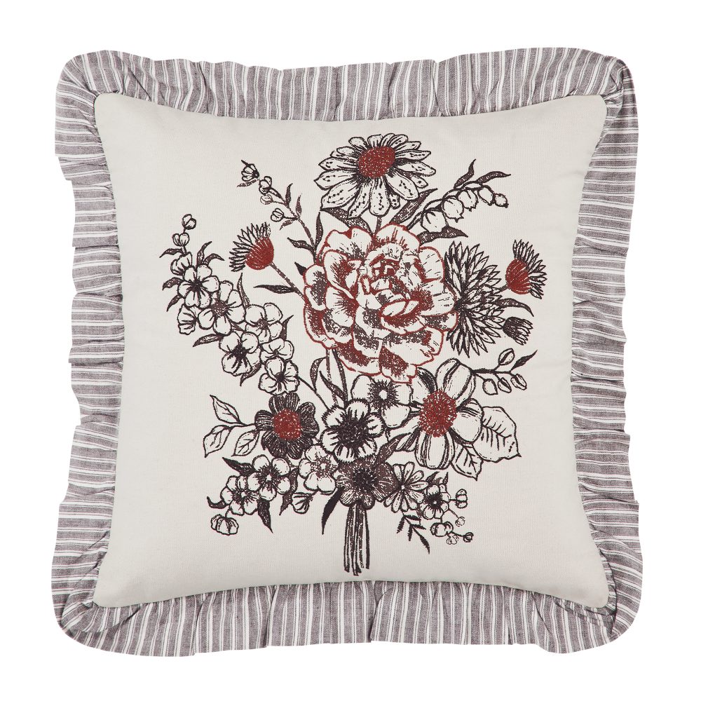 A classy bouquet to light up your home year-round. The Florette Floral Bouquet Pillow measures 18x18 inches and features detailed flowers in deep coffee tones with mauve red highlights. Reverses to a striped backing with a matching wide ruffle for a chic, French country style that adds elegance to your home. Constructed from 100 percent cotton with a polyester fill. Machine washable and iron safe. Coordinates with the Florette Collection from VHC for accent and foundational pieces in a romantic modern farmhouse style with the quality you would expect from over 20 years of satisfied customers.