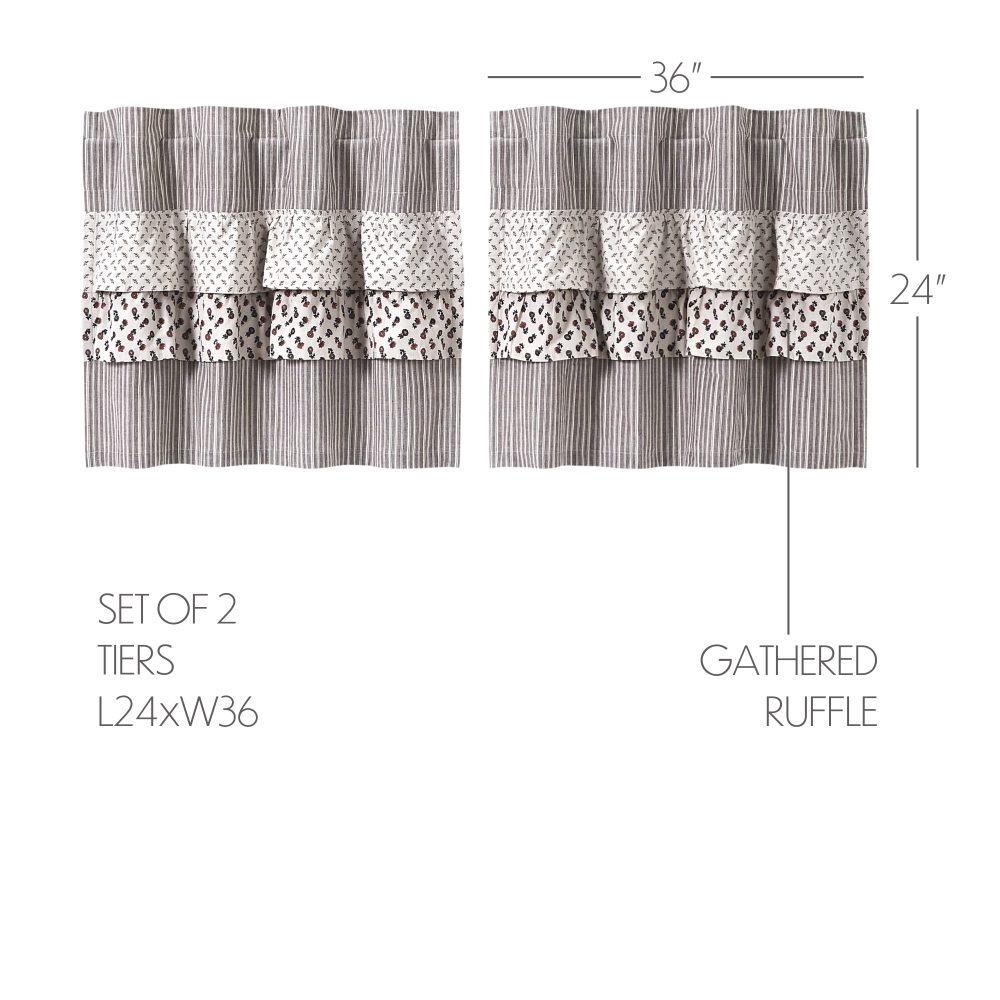 • FRENCH COUNTRY TIER SET: Includes two 24 by 36 inch tier curtains with a 3.25 inch rod pocket and hidden hanging loops for easy installation. Tier or cafe curtains are a great way to add privacy while still allowing unfiltered sunlight to come through from above.