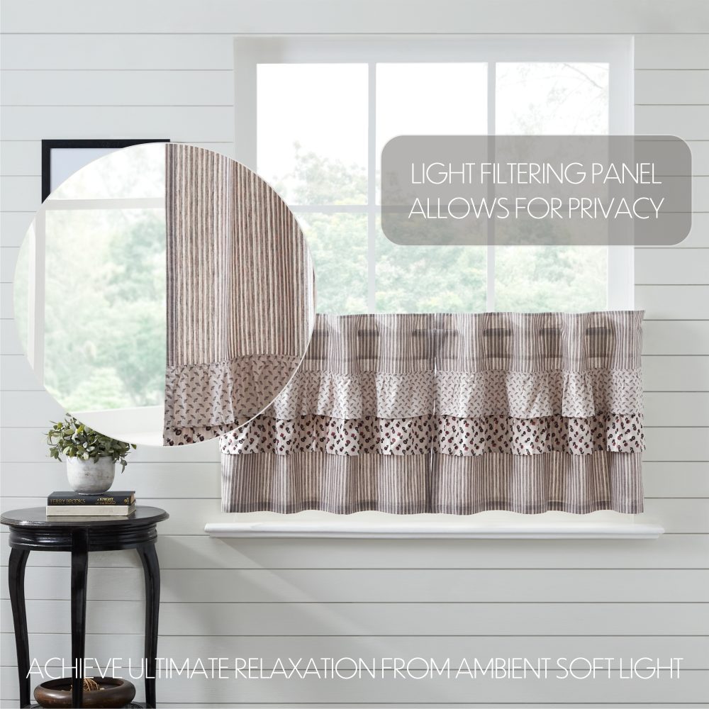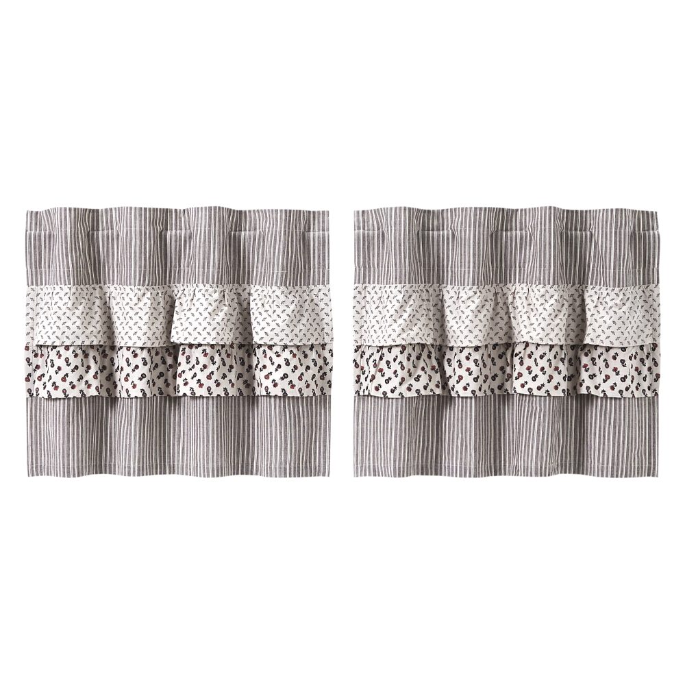 Create the perfectly charming country window of your dreams with these 24x36 inch tier-style curtains. Featuring a neutral color palette with light taupe, coffee brown, and small pops of mauve red, these short curtains provide just the right balance of privacy and sunshine. Classic farmhouse floral prints and stripes add a fun touch without being overwhelming. Pair with a matching valance or prairie swag for a fully decorated look or alone for a simple pop of color and character. Also known as cafe or bistro curtains, these are a particularly good fit for decorating vintage kitchens, laundry rooms, and small bathroom windows.