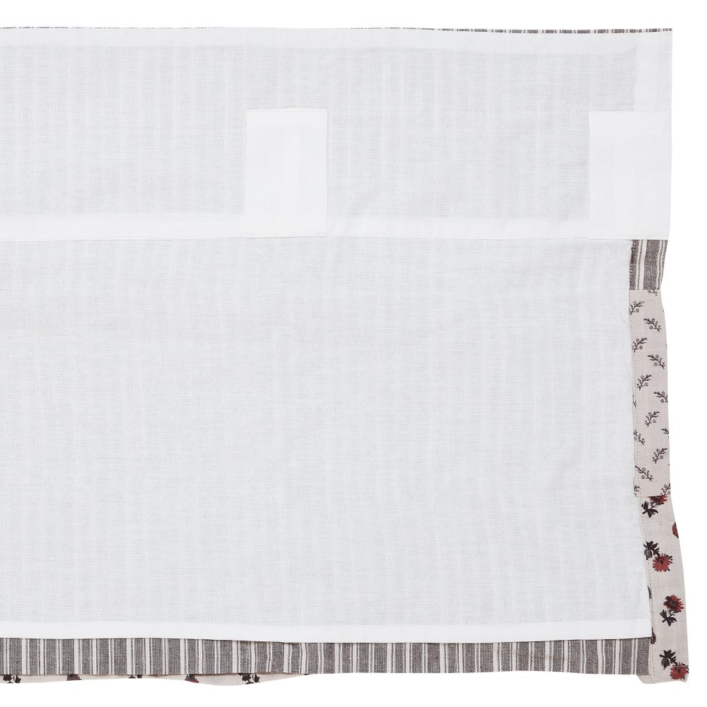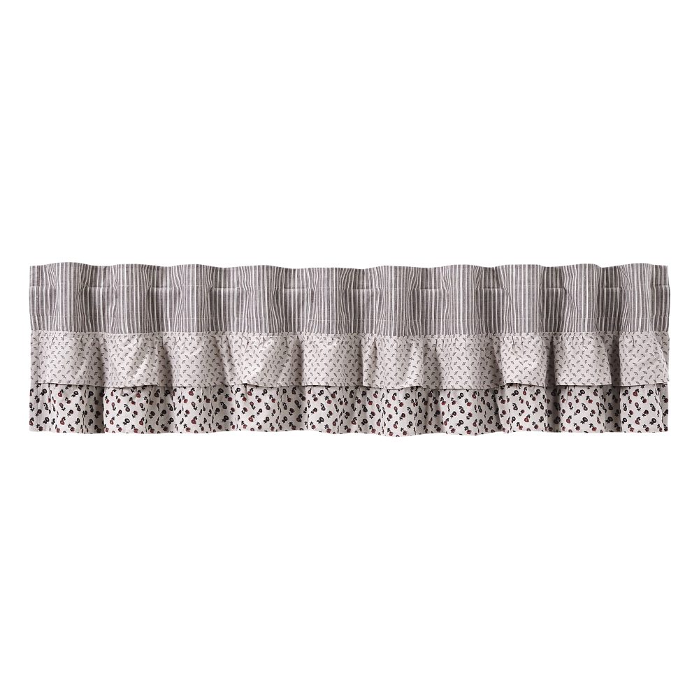 Layered ruffles and patterns create a charming French country look. The Florette Ruffled Valance 16x90 includes a neutral color palette with light taupe, coffee brown, and small pops of mauve red. Classic farmhouse floral prints and stripes add a fun touch without being overwhelming. The valance is lined with soft, white cotton to prevent fading and includes a rod pocket and loops for easy hanging.