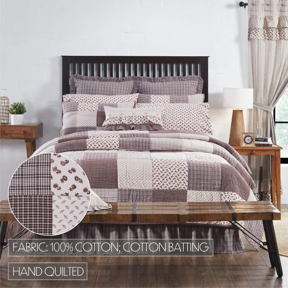 A stunning patchwork of white, coffee brown, soft taupe and splashes of mauve red enhance the look of your bedroom and add an elegant, French country look to your home. The Florette Twin Quilt measures 68 by 86 inches and features square quilt blocks with a variety of ditsy florals and micro check plaids. The 100 percent cotton quilted bedspread includes warm, cotton batting and is backed by a solid coffee brown plaid. Machine washable and iron safe, this durable quilt is constructed with stitch in the ditch and echo quilting techniques for superior resistance to normal wear and tear. Coordinates with the Florette Collection by VHC for feminine, cottage-inspired style with the quality you can expect from over 20 years of happy customers.