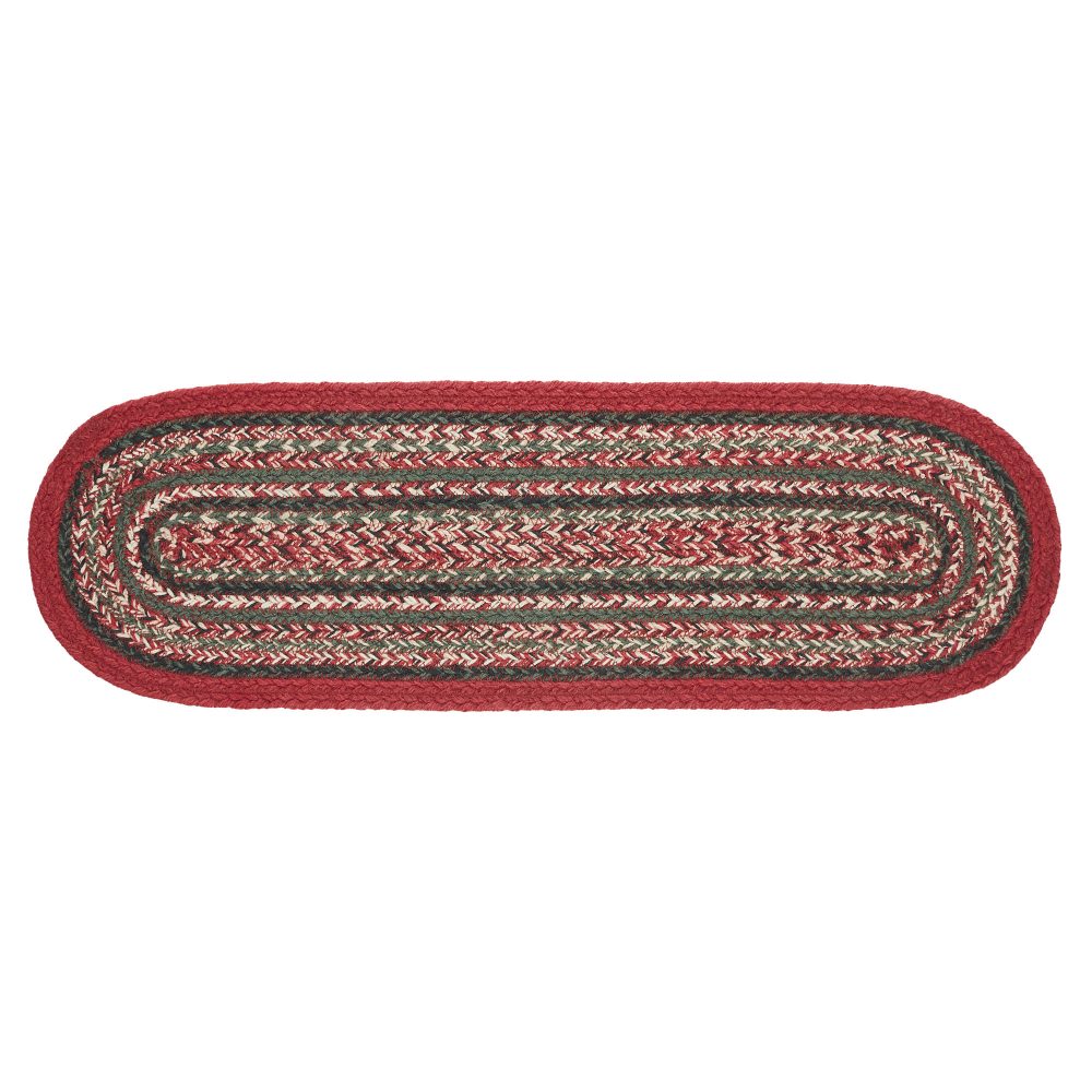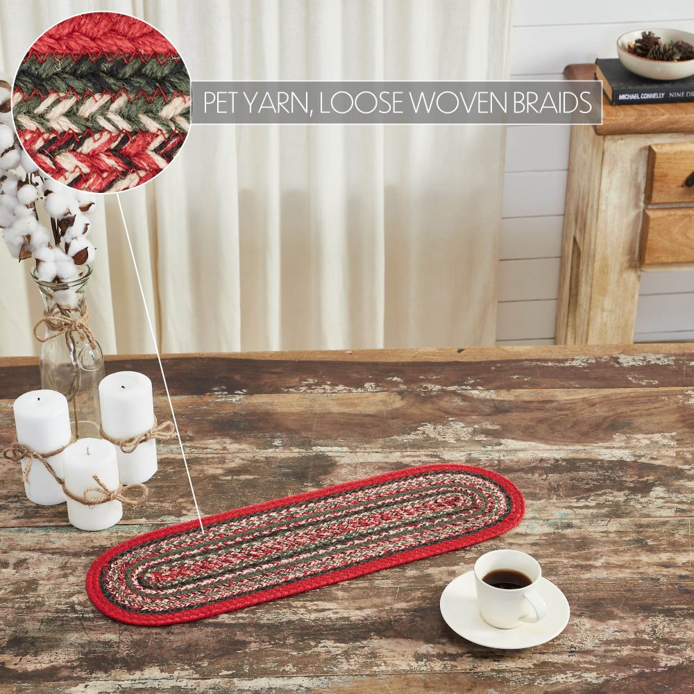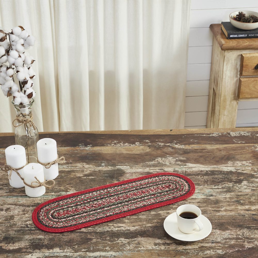 Make your table warm and welcoming this Christmas with deep shades of green and bright red. The Forrester Indoor/Outdoor Oval Runner measures 8 x 24 inches and features rows of braided recycled PET yarn in a loose weave. The water-resistant material combines the traditional look of a braided runner with easy care. Coordinates with matching rugs and placemats from the Forrester Collection by VHC for a complete rustic country look.