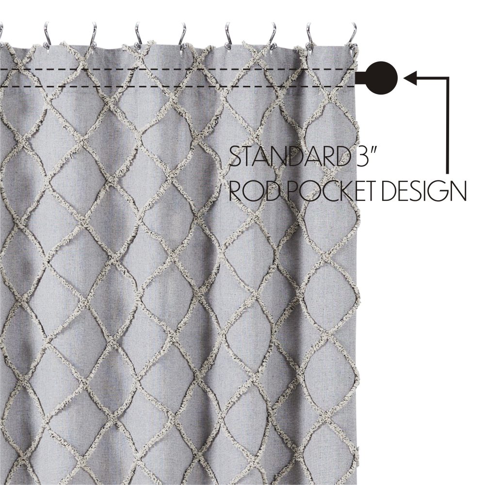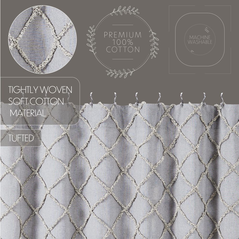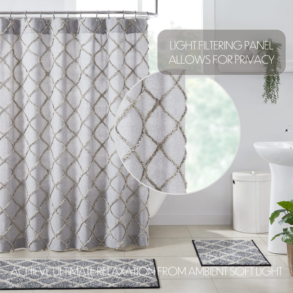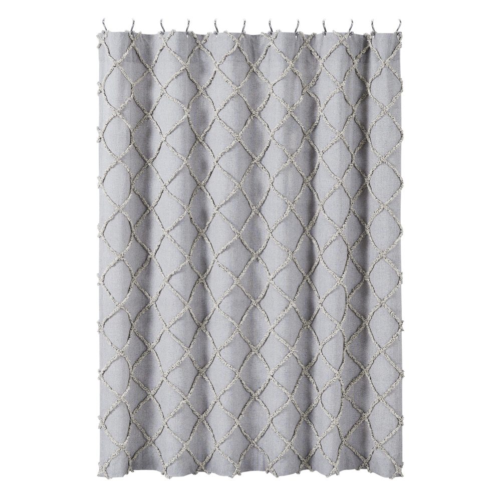 The Frayed Lattice Creme & Black Shower Curtain transforms your bath with classic country charm. Features a geometric design in tufted denim grey, soft black and creme. Measures 72 by 72 inches to fit standard sized showers and baths. Easily hang this classic country bath curtain with shower hooks of your choosing (not included) using the button holes attached. A 3" rod pocket is also available as an alternative hanging method.