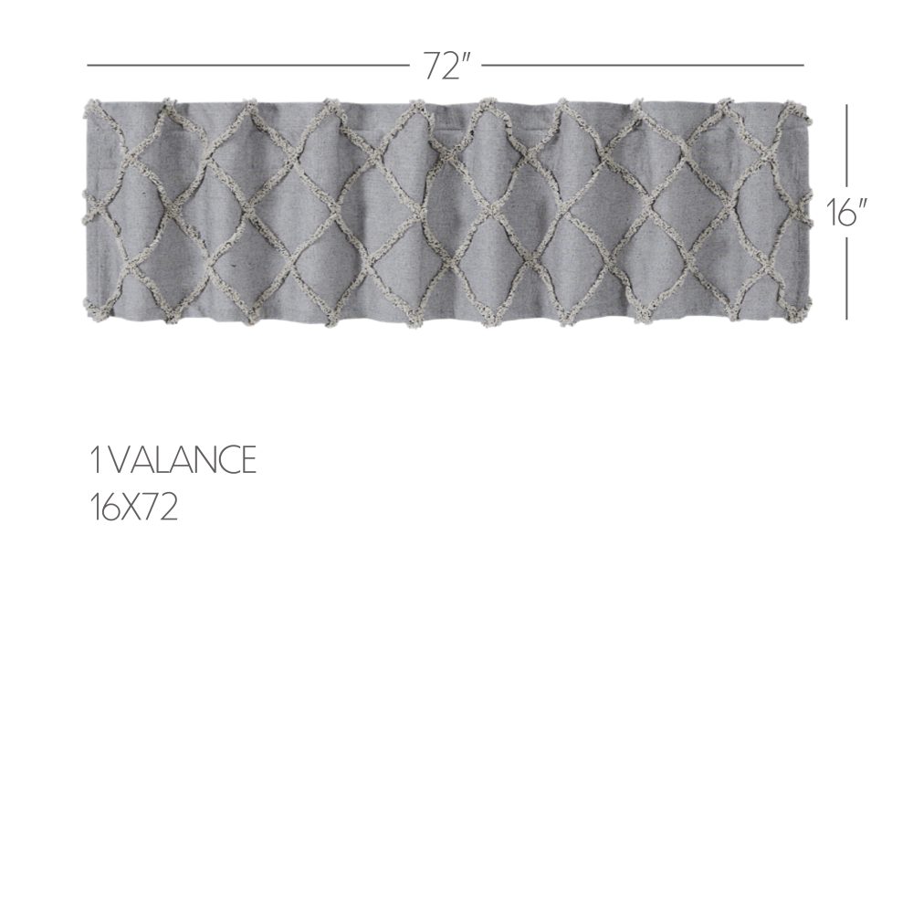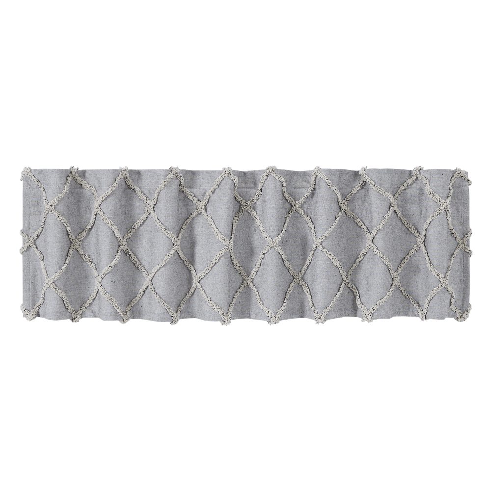 The perfect pop of texture. Create a soft, country look with the Frayed Lattice Creme & Black Valance 16x72. Textured fabric features a tufted, geometric design creating a lattice look perfect for modern farmhouse decor. Features a soft, white cotton lining to prevent fading and a rod pocket for easy hanging.