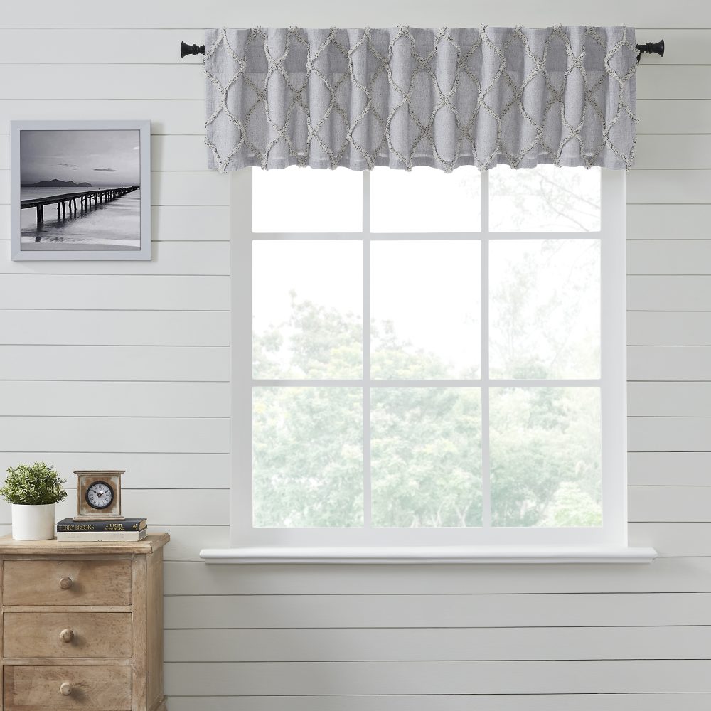 The perfect pop of texture. Create a soft, country look with the Frayed Lattice Creme & Black Valance 16x90. Textured fabric features a tufted, geometric design creating a lattice look perfect for modern farmhouse decor. Features a soft, white cotton lining to prevent fading and a rod pocket for easy hanging.