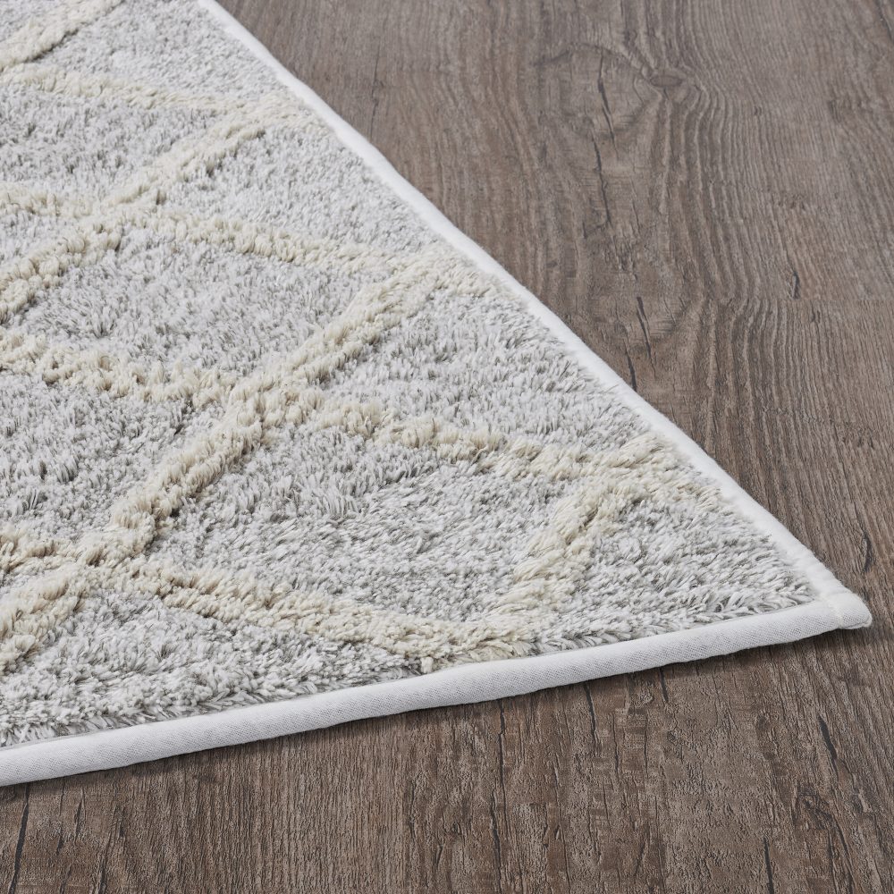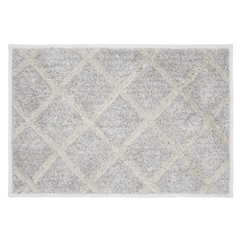 Step out of the shower and into cozy modern farmhouse bliss. The Frayed Lattice Oatmeal Bath Mat 20x30 features a tufted geometric diamond pattern in a mix of soft white and light oatmeal tan in premium, ultra absorbent cotton. It is trimmed with a thin strip of solid white. Backed with textured rubber to produce a quality, non-slip surface without the need for a separate rug pad. This tufted bath mat is a great finishing piece for bathrooms or laundry rooms where you need the perfect balance of style and functionality.