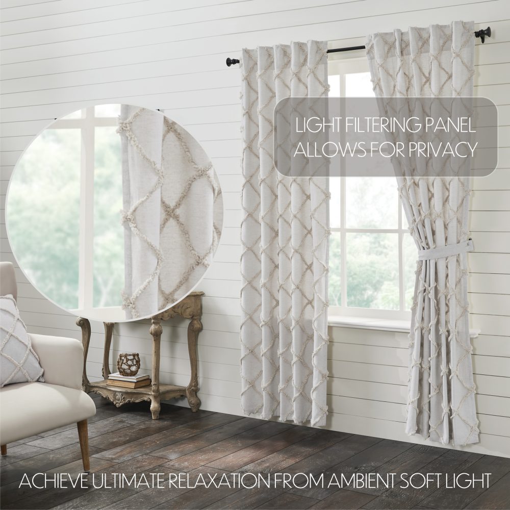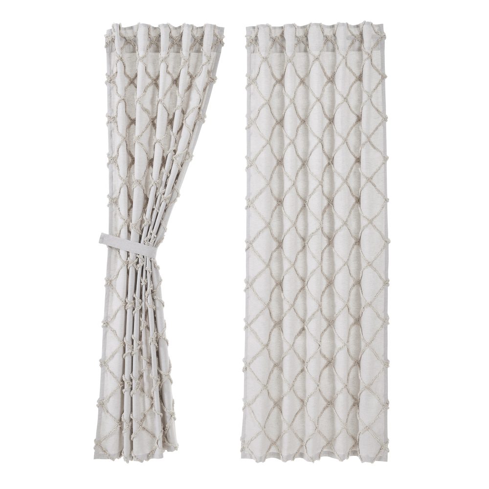 Elevate the look of your living room with modern farmhouse style curtains. This 84x40 Frayed Lattice Oatmeal Panel Set of 2 features a soft white cotton lining and classic oatmeal tan and soft white hues. The textured, tufted weave features a clean geometric pattern. Includes a 3.25 inch rod pocket and hidden loops for easy hanging and matching tie backs.