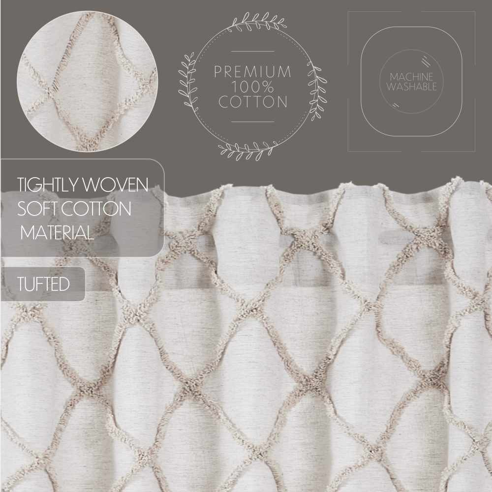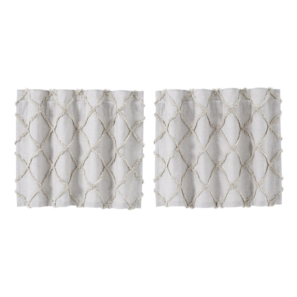 Create the perfectly charming country window of your dreams with these 24x36 inch tier-style curtains. Featuring oatmeal tan and soft white, these short curtains provide just the right balance of privacy and sunshine. The textured, tufted weave features a clean geometric pattern. Pair with a matching valance or prairie swag for a fully decorated look or alone for a simple pop of color and character. Also known as cafe or bistro curtains, these are a particularly good fit for decorating vintage kitchens, laundry rooms, and small bathroom windows.