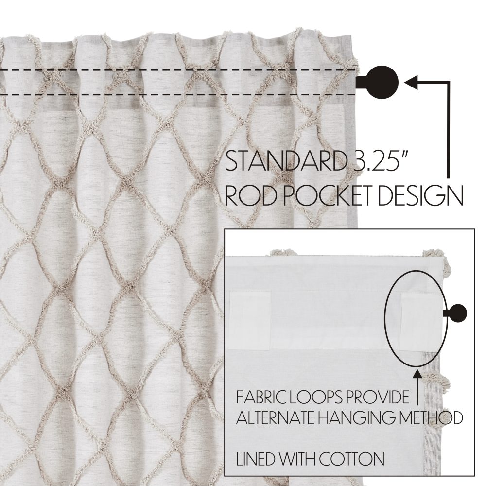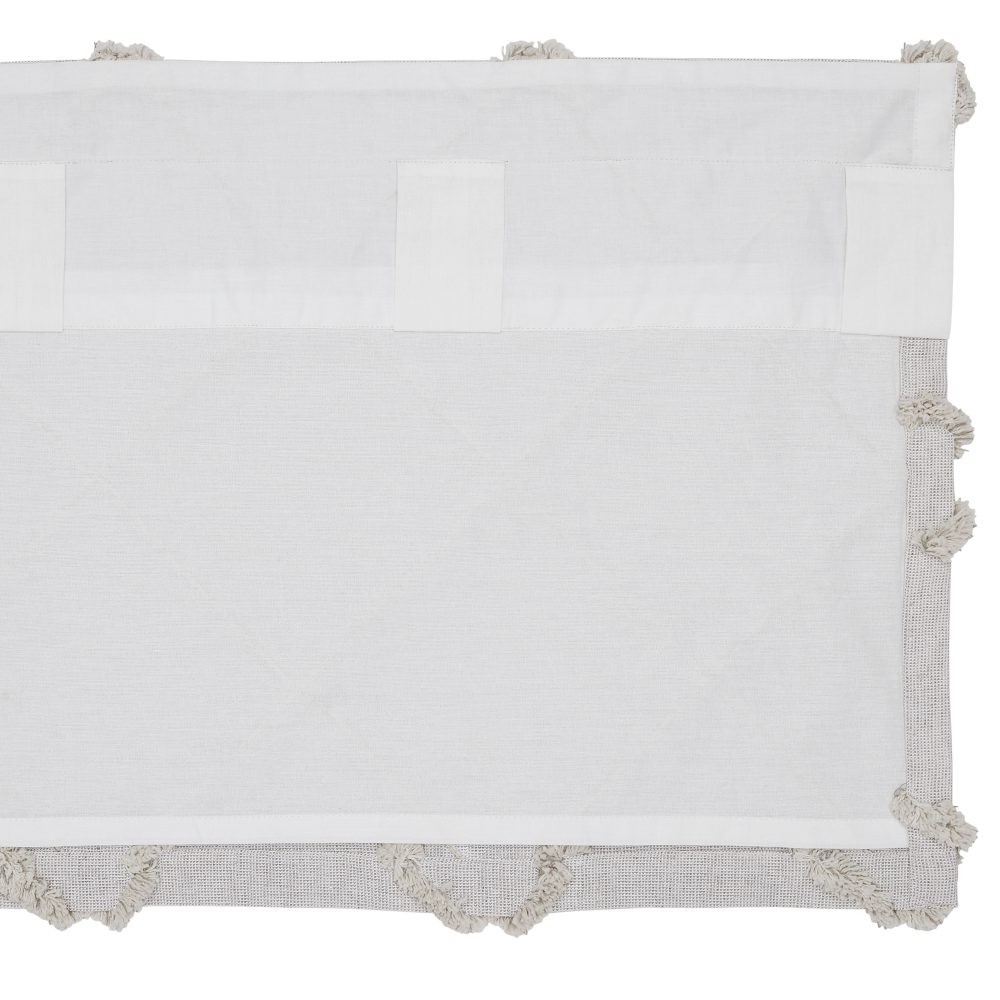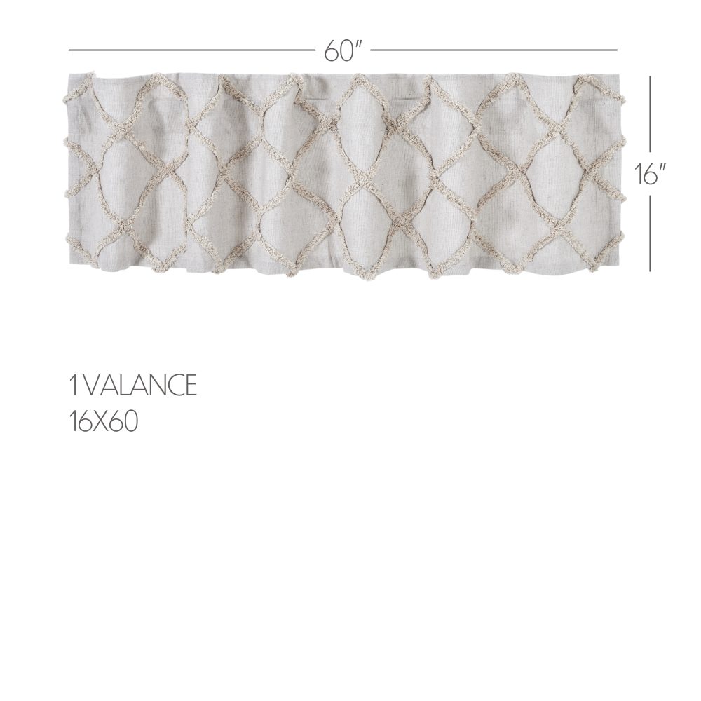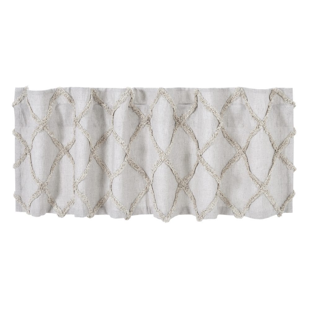 The perfect pop of texture. Create a soft, country look with the Frayed Lattice Oatmeal Valance 16x60. Textured fabric features a tufted, geometric design creating a lattice look perfect for modern farmhouse decor. Features a soft, white cotton lining to prevent fading and a rod pocket for easy hanging.