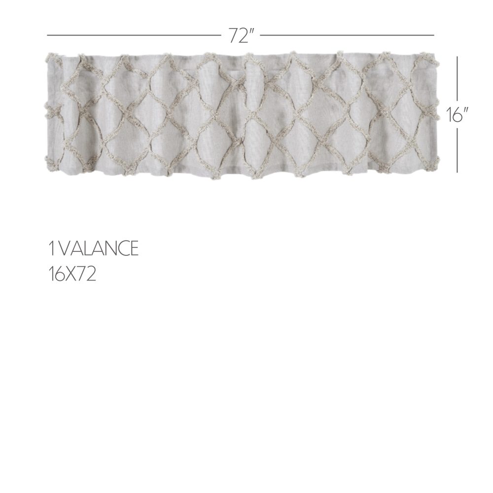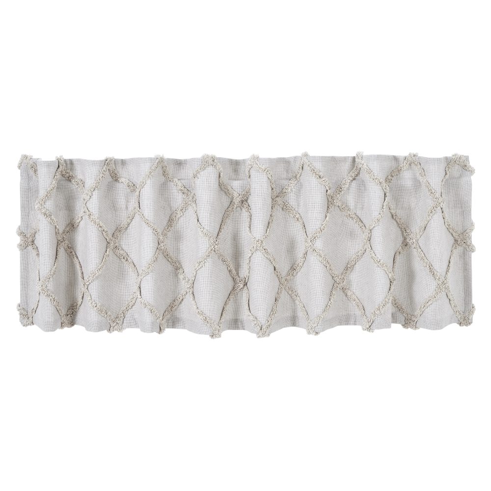 The perfect pop of texture. Create a soft, country look with the Frayed Lattice Oatmeal Valance 16x72. Textured fabric features a tufted, geometric design creating a lattice look perfect for modern farmhouse decor. Features a soft, white cotton lining to prevent fading and a rod pocket for easy hanging.