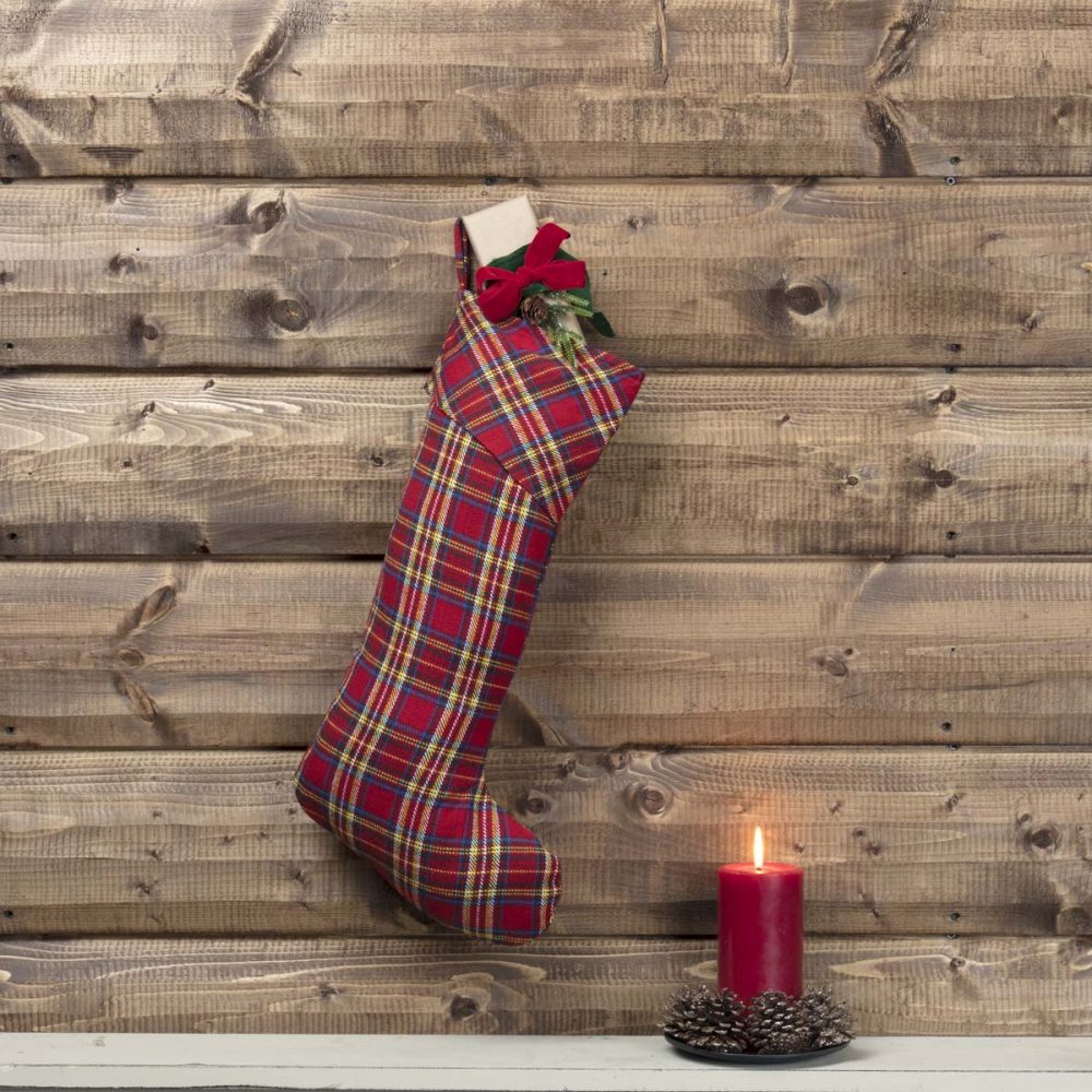 - DETAILED FEATURES: This truly festive plaid stocking features a barn red-base plaid with accents of cobalt, lemon meringue, ebony, and creme. The slanted cuff and body are lined in barn red taffeta for extra durability. Finished with a turned edge seam and a plaid hanging loop.