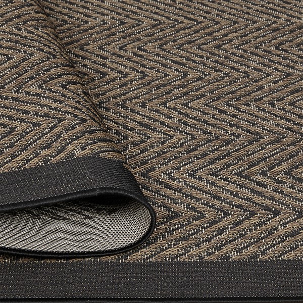 Style your home or patio with the Madison Park Dover Textured Chevron Indoor/Outdoor Rug. Made in Turkey, this polypropylene area rug features a textured flatweave chevron pattern in a natural hue with a black border, for a classic look. Stain and fade resistant, this indoor/outdoor rug is durable for all seasons and easy to clean.