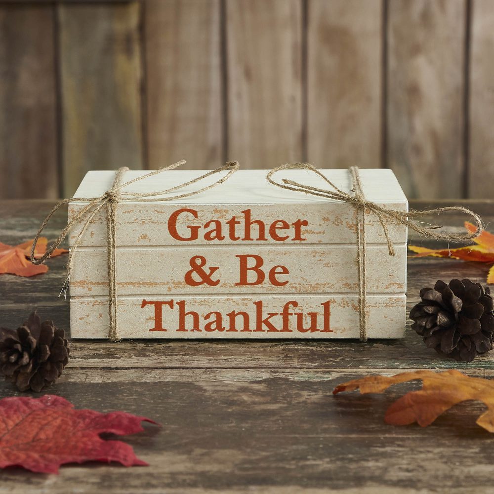 • PREMIUM CRAFTSMANSHIP & DESIGN: Elevate your seasonal decor with the VHC Brands Gather & Be Thankful Faux Book Stack, a farmhouse rustic decorative home accent measuring 2.5x6x4 inches, expertly crafted from inviting MDF and showcasing a charming distressed finish. This versatile tabletop shelf decor piece features soft turtledove gray and deep burnt orange hues and is delicately stenciled with the message “Gather & Be Thankful,” creating a cozy, meaningful focal point for your Fall and Thanksgiving celebrations whether placed on a kitchen mantel, dining room centerpiece, or entryway console.