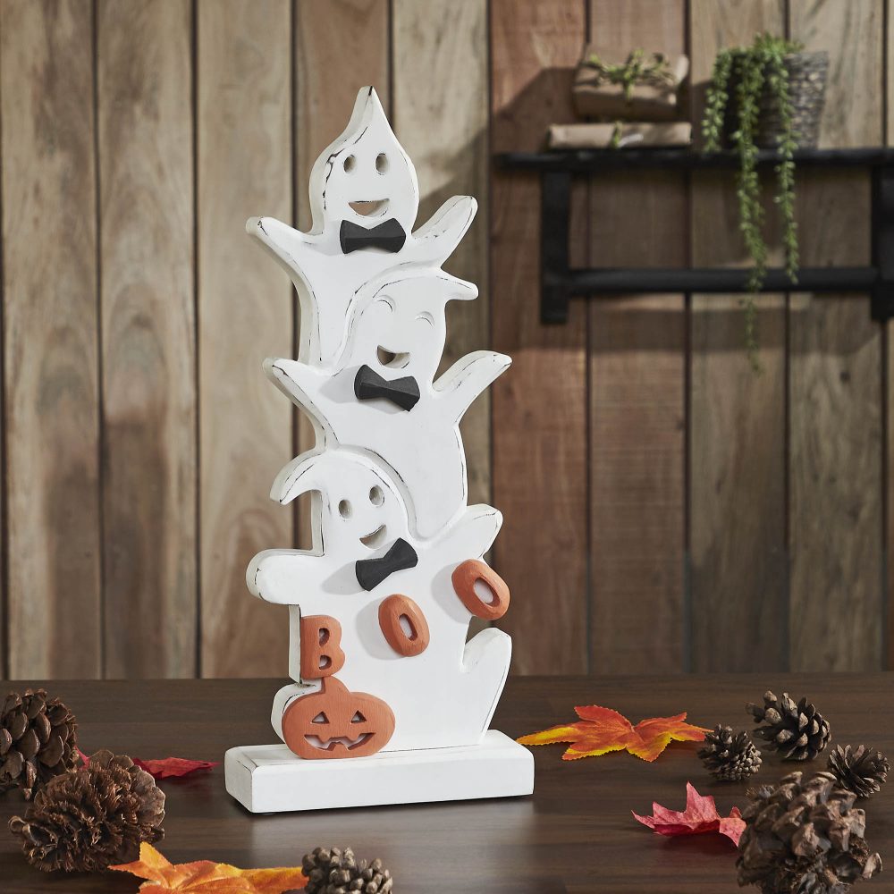 - FESTIVE FARMHOUSE FEATURES: Adorn your space with the VHC Brands Whimsical Halloween Ghost Stack BOO Wooden Figurine, expertly crafted from smooth, natural tropical wood and painted in bright white and pitch black with rustic detailing, measuring 16″ Tall x 6.5″ Wide x 2″ Deep; this charming piece features three stacked ghosts with bowties and “BOO!” lettering, offering a durable, year-after-year farmhouse or cottage-core accent for your tabletop, mantel, or entryway, easily cleaned with a soft cloth.