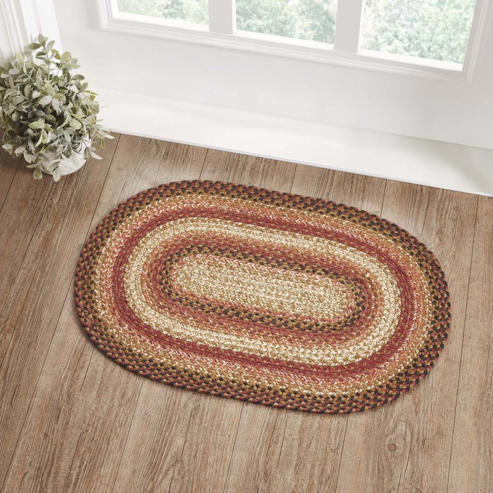 Create a warm, homey feeling with primitive fall colors in a curl-resistant jute blend that adds style and safety anywhere a small accent rug is needed. The Ginger Spice Jute Rug measures 20x30 inches and features a classic oval shape and tight braids constructed with a durable jute blend. The special blend relaxes faster and stays flat. Features a blend of terra cotta, burgundy and dark tan for a warm, rustic look that complements a wide array of country farmhouse and Autumn decor.