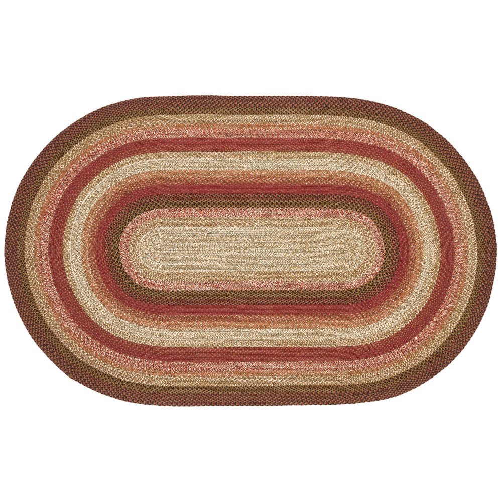 Create a warm, homey feeling with primitive fall colors in a curl-resistant jute blend that adds style and safety anywhere a versatile area rug is needed. The Ginger Spice Jute Rug measures 60x96 inches and features a classic oval shape and tight braids constructed with a durable jute blend. The special blend relaxes faster and stays flat. The included PVC mat makes sure your beautifully braided jute rug stays exactly where it should. Features a blend of terra cotta, burgundy and dark tan for a warm, rustic look that complements a wide array of country farmhouse and Autumn decor.