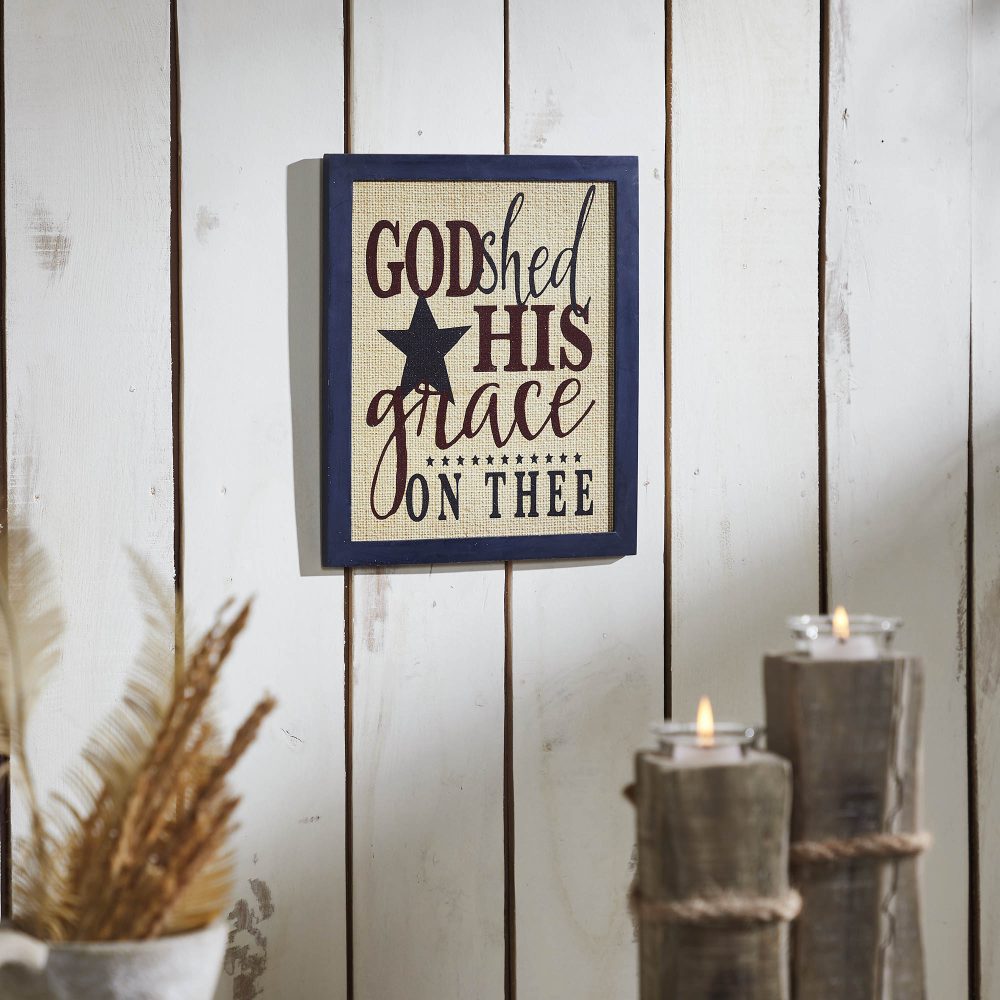 Celebrate the spirit of Americana with the VHC Brands Patriotic God Shed His Grace On Thee Framed MDF Wall Sign 12x10. This beautifully crafted decorative sign features the inspiring quote "God Shed His Grace on Thee," accented with stars on a burlap-look background. Framed in a rich navy blue border, the design offers a perfect blend of rustic farmhouse charm and patriotic pride, ideal for Fourth of July celebrations or year-round decor. This versatile rectangular wall sign complements any room, including living rooms, dining rooms, kitchens, bedrooms, bathrooms, or entryways. Its warm burlap tan background, burgundy accents, and navy blue frame create a classic Americana color palette that fits seamlessly with rustic and country-inspired interiors. The distressed appearance adds a vintage-inspired touch, making it a timeless addition to your patriotic-themed decor. Pre-drilled holes allow for easy hanging, while its sturdy design also makes it suitable for standing display on shelves, mantels, or countertops. Maintaining the VHC Brands Patriotic God Shed His Grace On Thee Wall Sign is simple-just wipe it clean with a soft cloth to preserve its vibrant digital print and distressed finish. Whether displayed as a standalone piece or paired with other patriotic accents, this sign combines meaningful design, quality craftsmanship, and rustic elegance. It's the perfect way to showcase your love for country and faith while enhancing your home's warm, inviting atmosphere.