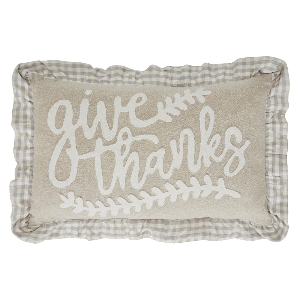 - PREMIUM CONSTRUCTION & FESTIVE DESIGN: Enhance your fall and Thanksgiving decor with this 14×22 inch decorative accent pillow, meticulously crafted from sumptuously soft natural cotton chambray, showcasing the sentiment “Give Thanks” beautifully embroidered in a natural handwritten font, and finished with a charming grey and creme buffalo check ruffle for an authentic farmhouse, harvest, and cottage core appeal.