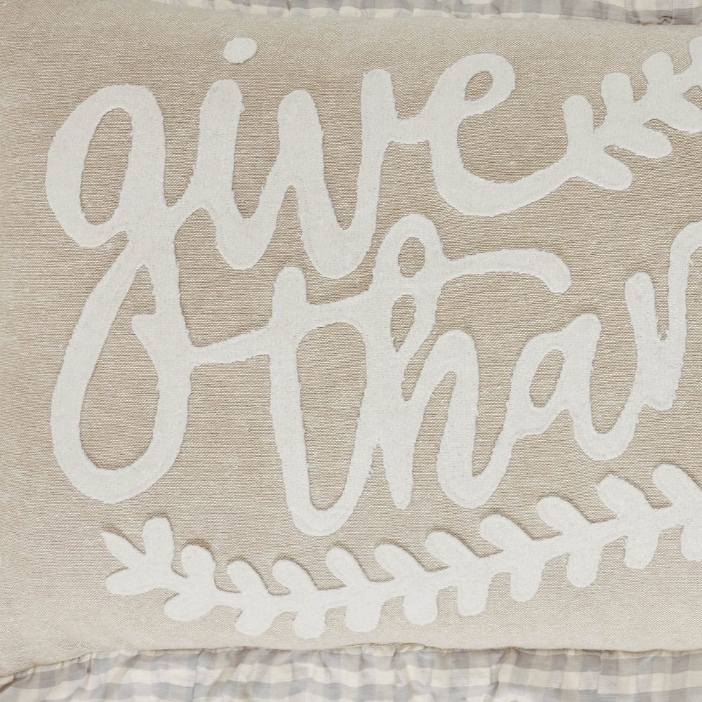 - EMBRACE FALL’S COZY CHARM: Infuse your home with the heartwarming spirit of gratitude and inviting farmhouse appeal, featuring beautifully appliqued “Give Thanks” on sumptuously soft cotton chambray.