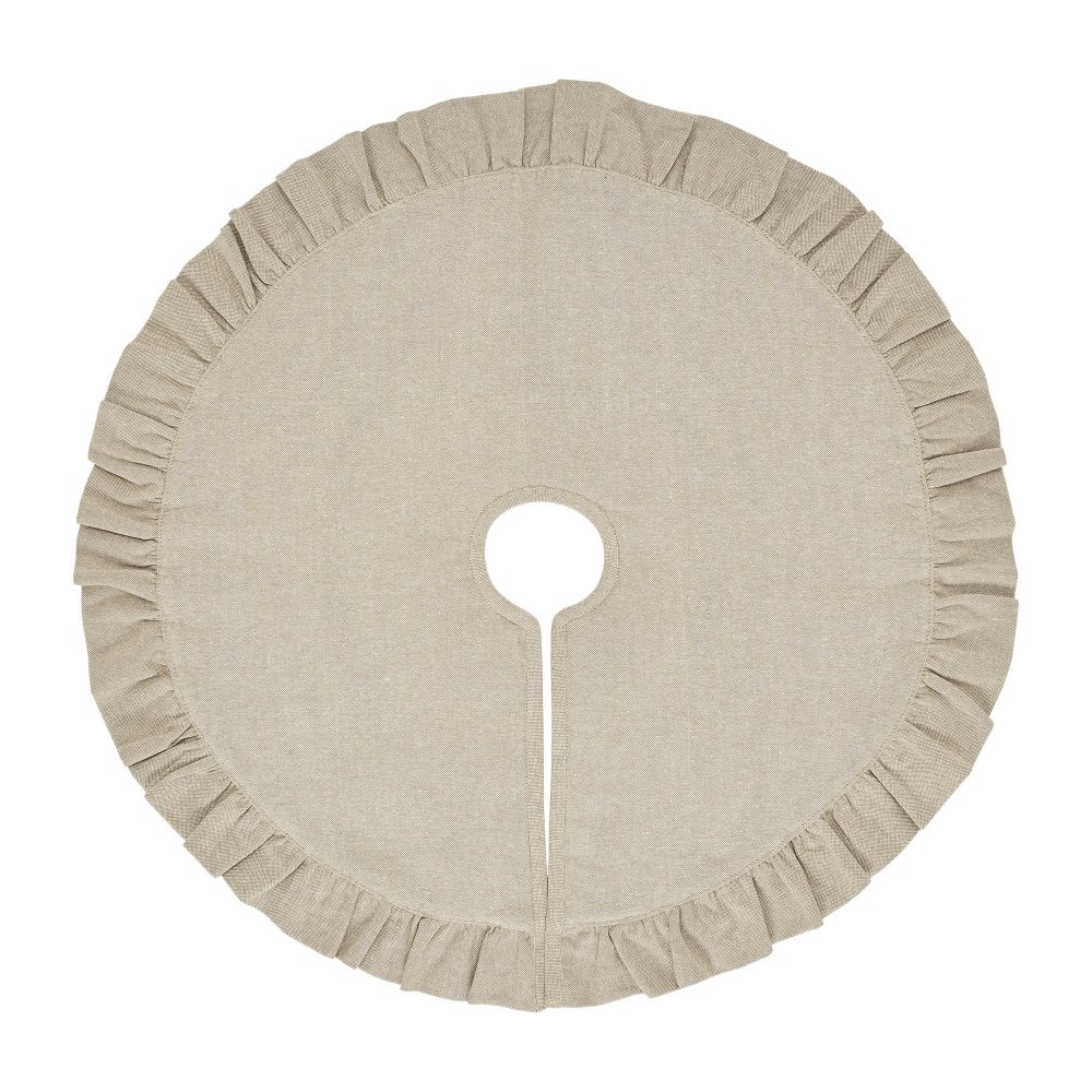 Add timeless style to your Christmas traditions with the Grace Grain Sack Stripe Tree Skirt. The round tree skirt features a 24 inch diameter. A warm creme base with nickel gray grain sack stripes will add simple, sophisticated style for a perfect farmhouse Christmas look. The vintage-inspired tree skirt reverses to a warm tan chambray fabric. That same fabric is featured in a deeply ruffled edge for a look that balances simple and elegant. The neutral Christmas tree skirt is made for yearly use with channel quilting for added style and durability. Pair with matching stockings for a complete, festive holiday look.
